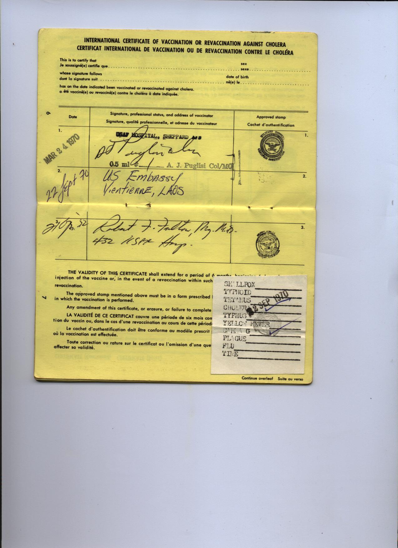 A bit of history attached below. My second of three Gamma Globulin shots @ Lima Site 20 Alternate (white paper) by the Flight Surgeon but attested to at the US Embassy in Vientiane, Laos on 9/22/70 ten days after a transfusion and 79 days before I came down with hep. on 1/11/71. It was given with a disposable syringe (new) rather than a jetgun. I got a cholera shot at the same time.
