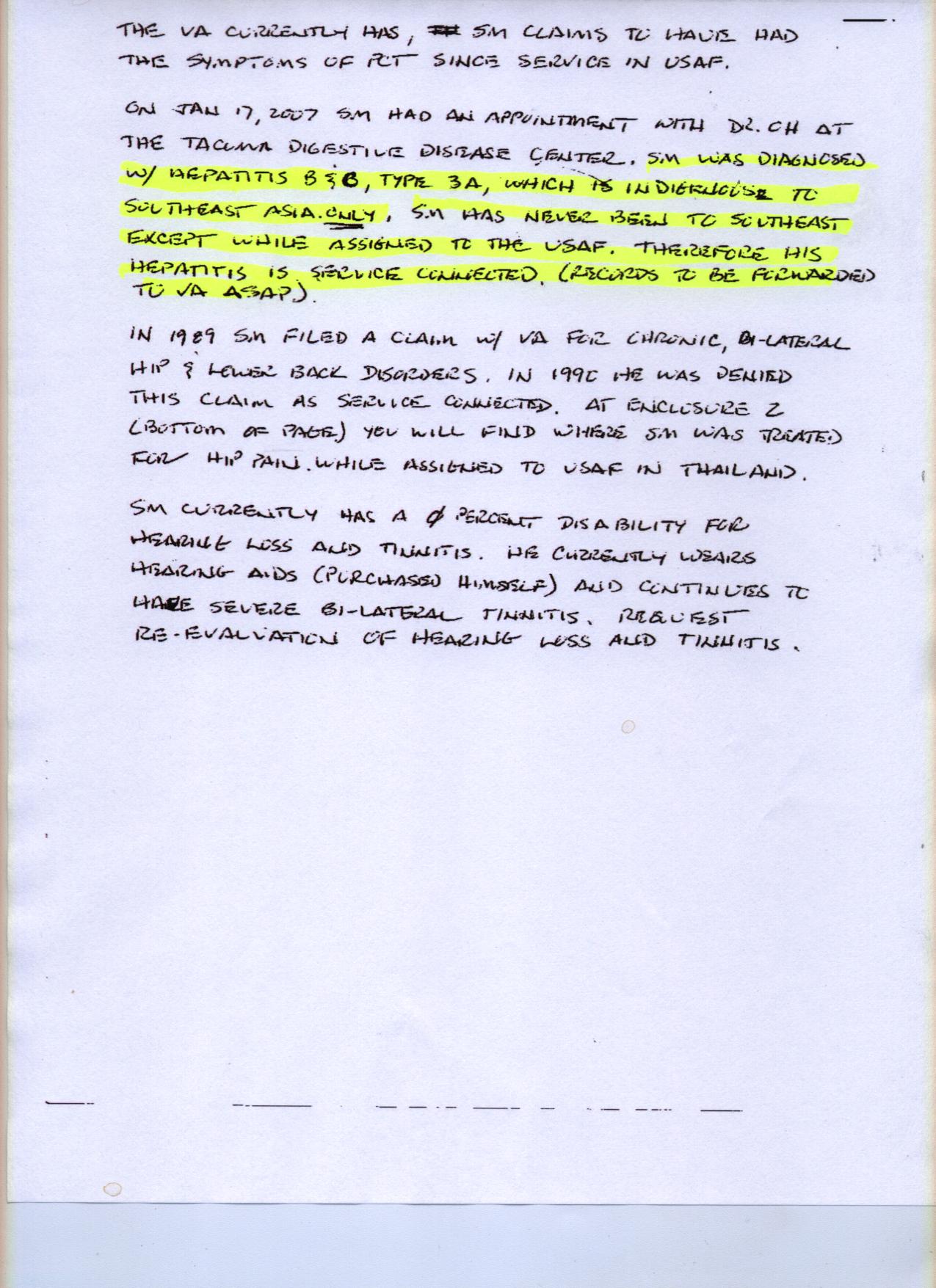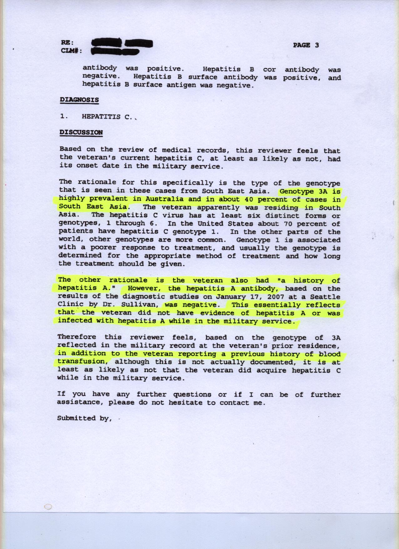 Case in point. I filed, or should say, technically refiled to reopen my HCV/PCT in 2007. Still ignorant of the ways of VSOs, I was doing this with the MOPH representing me. On my initial 21-4138, the rep. and I laid out all the reasons why I felt this was SC. One thing I insisted he enter on my sheet was the fact that my HCV genotype was 3A, dominant only in SEA at the time of my service there. Granted, I had hepatitis in service, but no one ever determined what flavor it was. I honestly believed it was HAV back then. It kicked my ass and I was sicker than a dog for months. Nevertheless, I survived and went on to recuperate after 6 weeks as an inpatient and several months of light duty. When I was diagnosed with PCT in 1992, the doctor ran the tests and determined I had been infected with HBV. He didn’t test me for HCV because it was still relatively unknown.