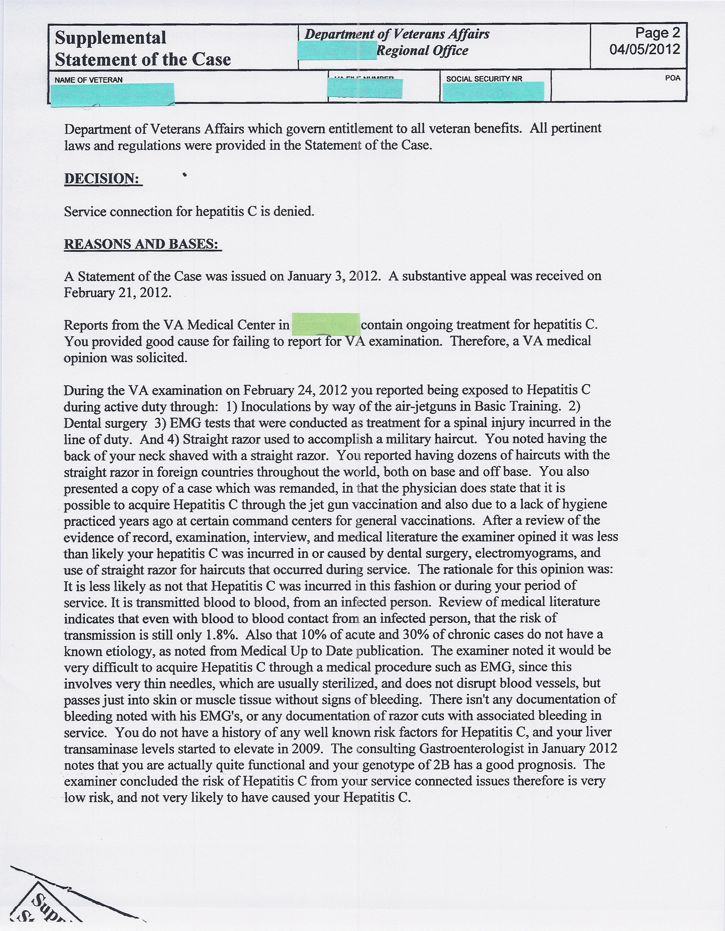 Reading down in the Reasons and Bases of the denial on Page two requires a lot of faith that the wind was blowing just so, the EMG needles were clean and sterilized in 1982, the Dentist was extremely more hygienic than his peers, the razors used in shaving were clean as a whistle, that administrative personnel were in the habit of recording accidental cuts from said razors in military rather than medical records and last but not least, that old Squidly is actually quite functional. Where the Hell did that come from? As for a HCV 2B genotype infection having a “good prognosis”,  somebody’s been smoking some really, really strong left-handed tobacco. This nexus must be from the “People actually can live with this virus and go on to lead productive lives” school. VA would have Squidly believe he is good to go and those nasty ASTs and ALTs are just a minor acute aberration that will resolve in time. They’re partially right. The numbers will go way down when he hits Stage 4 cirrhosis and the portal hypertension kicks in.