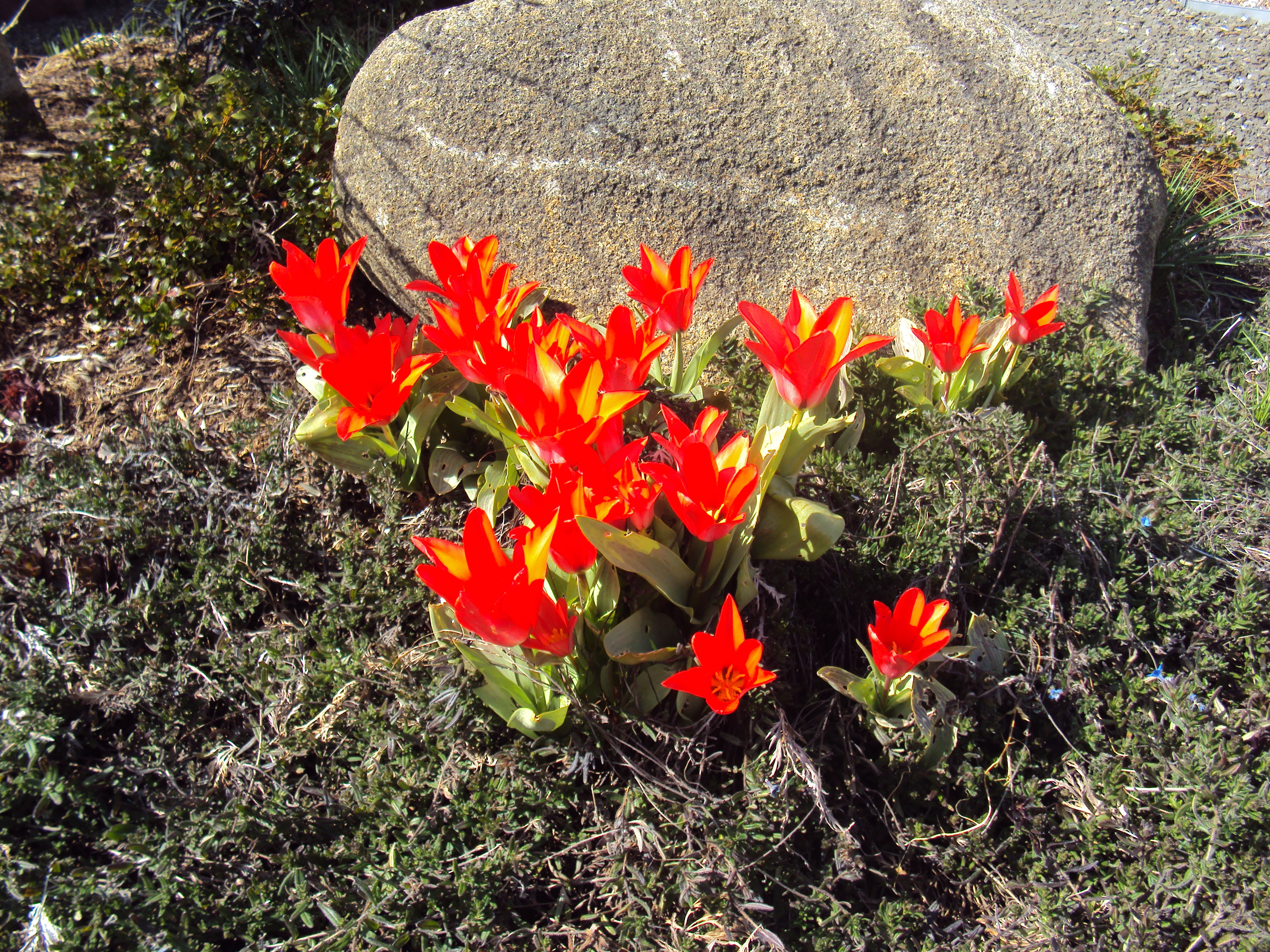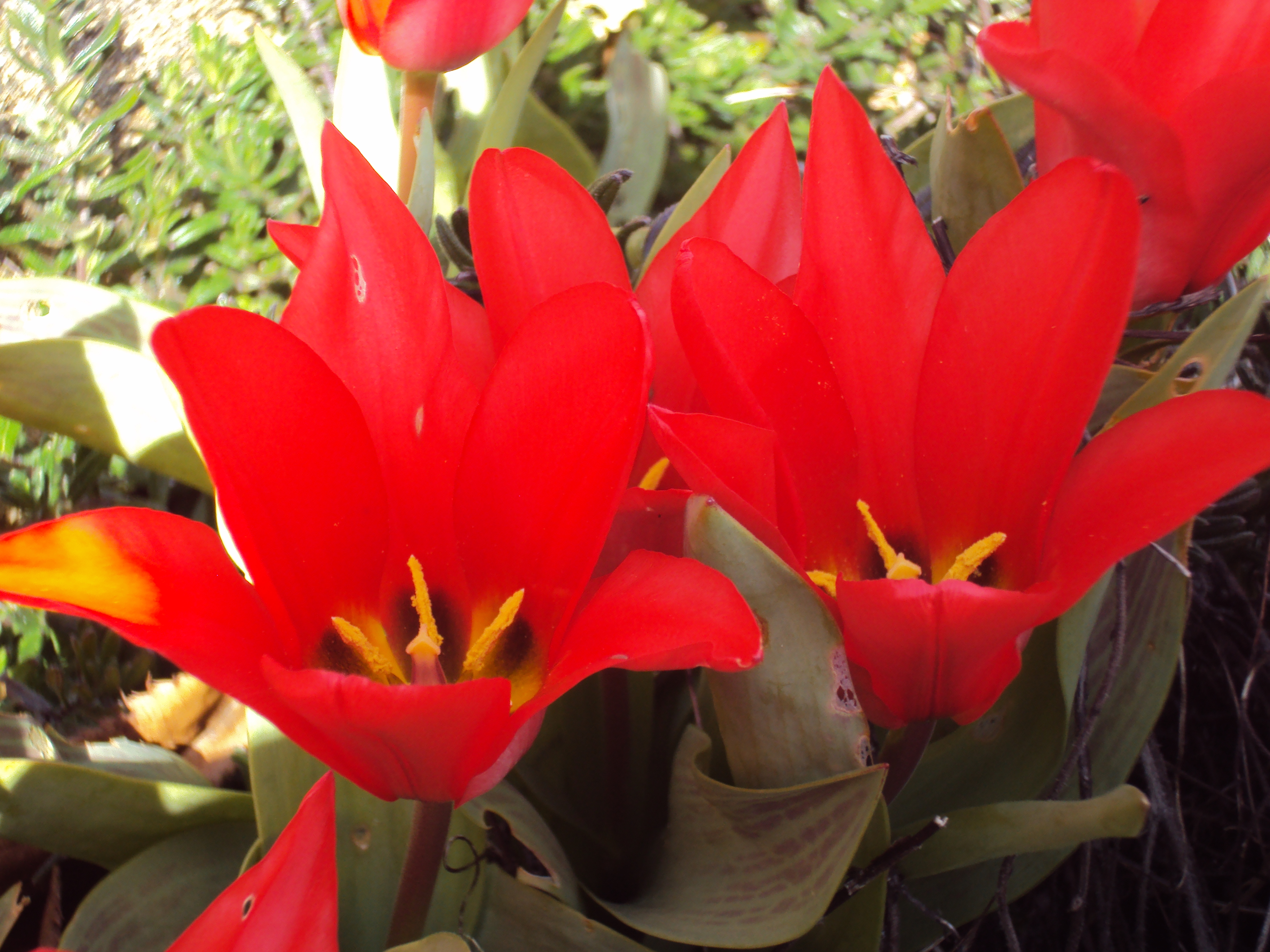 The sun is shining on these. They are almost pure red except for the gold stamens. The yellow is just the perfect reflection of this morning’s sun.
