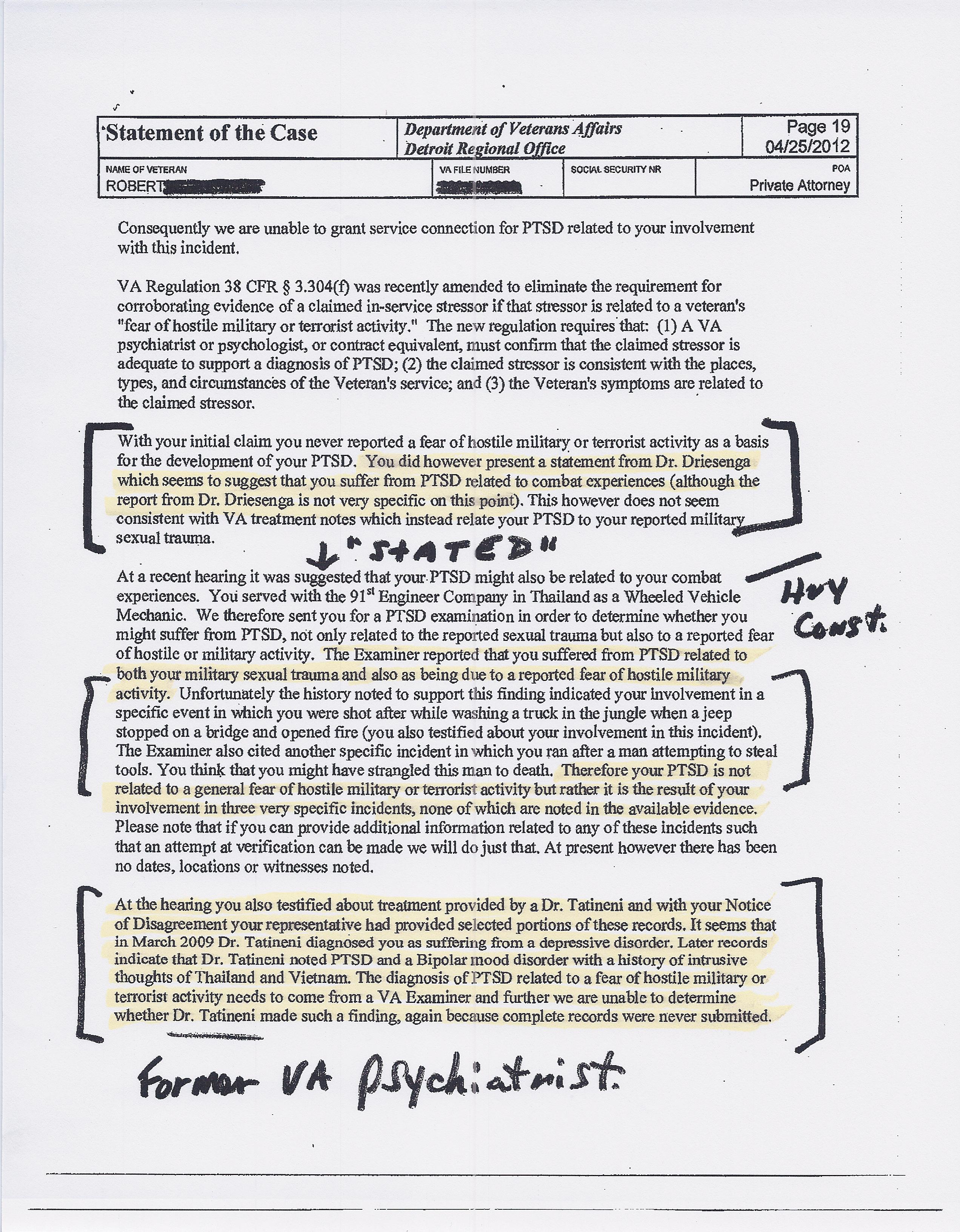 Remember the old movie sets with the crew called “continuity”? Everything had to remain in its place or be returned to where it was at the start of shooting a scene to prevent cars from jumping or silverware from disappearing. Likewise, your claim has to have continuity. Don’t allow it to be unstructured. Everything must occur the same way each time in the retelling. “My mental state is due to this: A)_____________; B)__________; and C)__________. It happened 2/3/1968. I was in Qui Nhon and they were shooting at me. I swear that the above is true and correct to the best of my knowledge and belief. Signed Vincent Vet. SSN 123-45-6789. ”