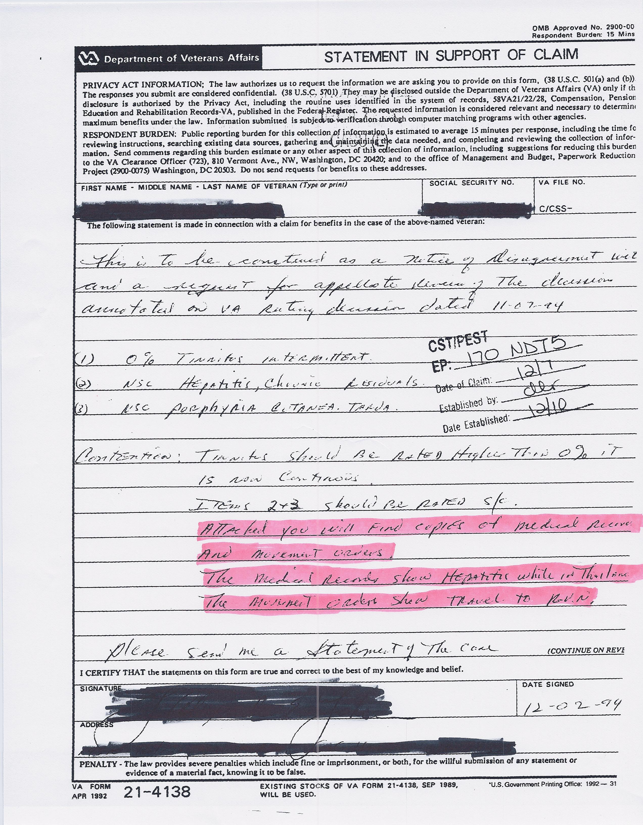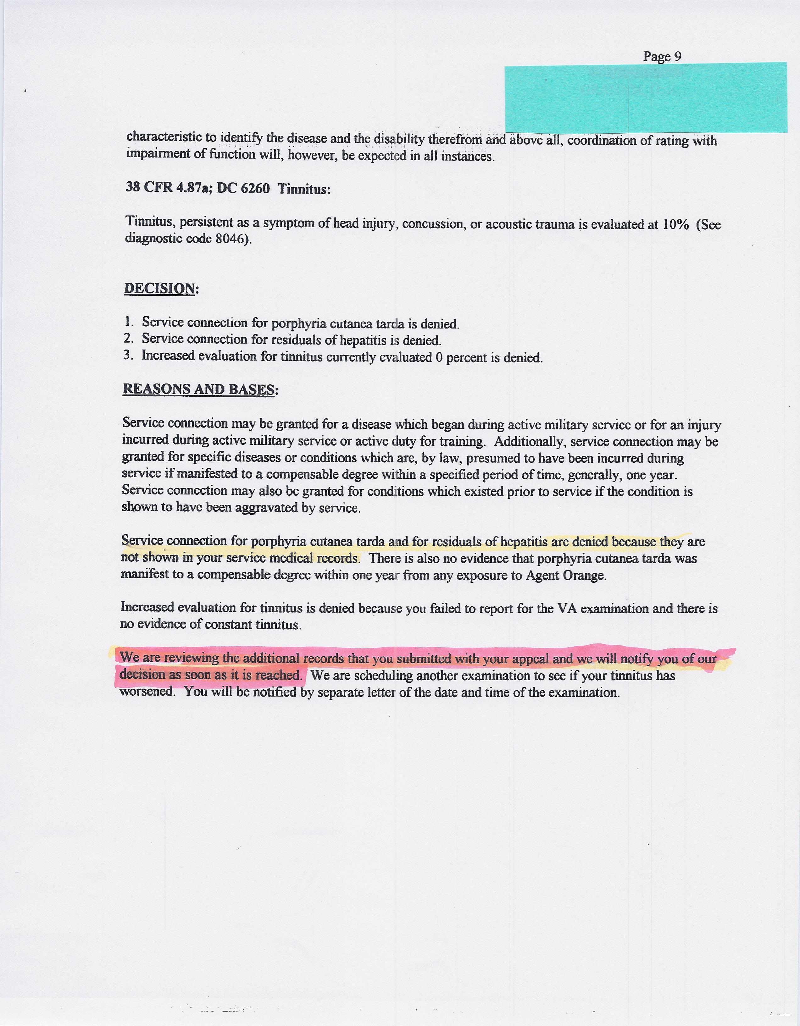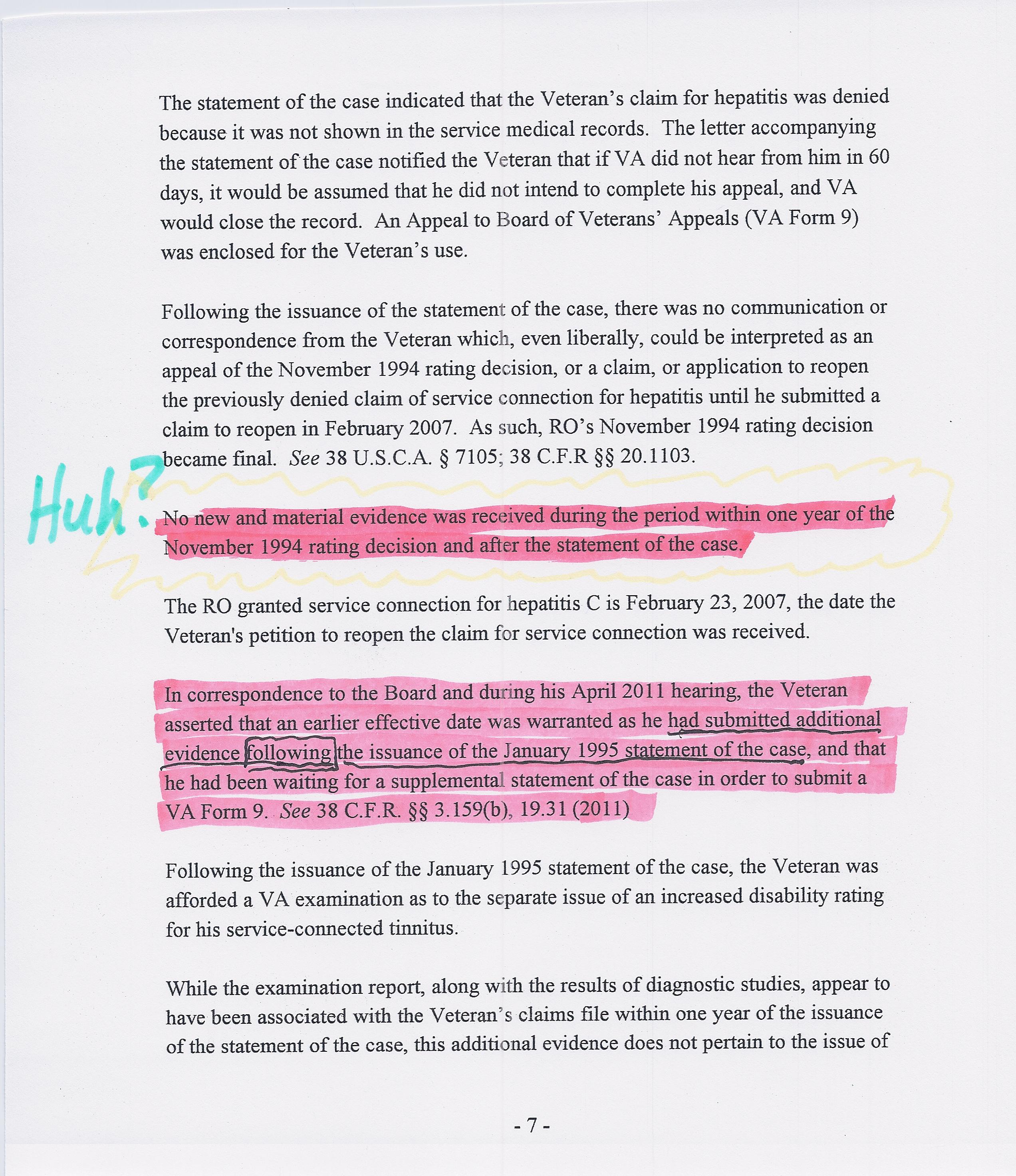 As to the Hepatitis claim, it’s simple. They insist I never mailed in any New and Material Evidence after the SOC. They are right. I mailed it in with my NOD. That is within the one year window of my denial. Semantics are the vA’s greatest weapon against you. They make a grand statement that is unarguably true but distorts the fabric of the claim. Read these highlighted portions: