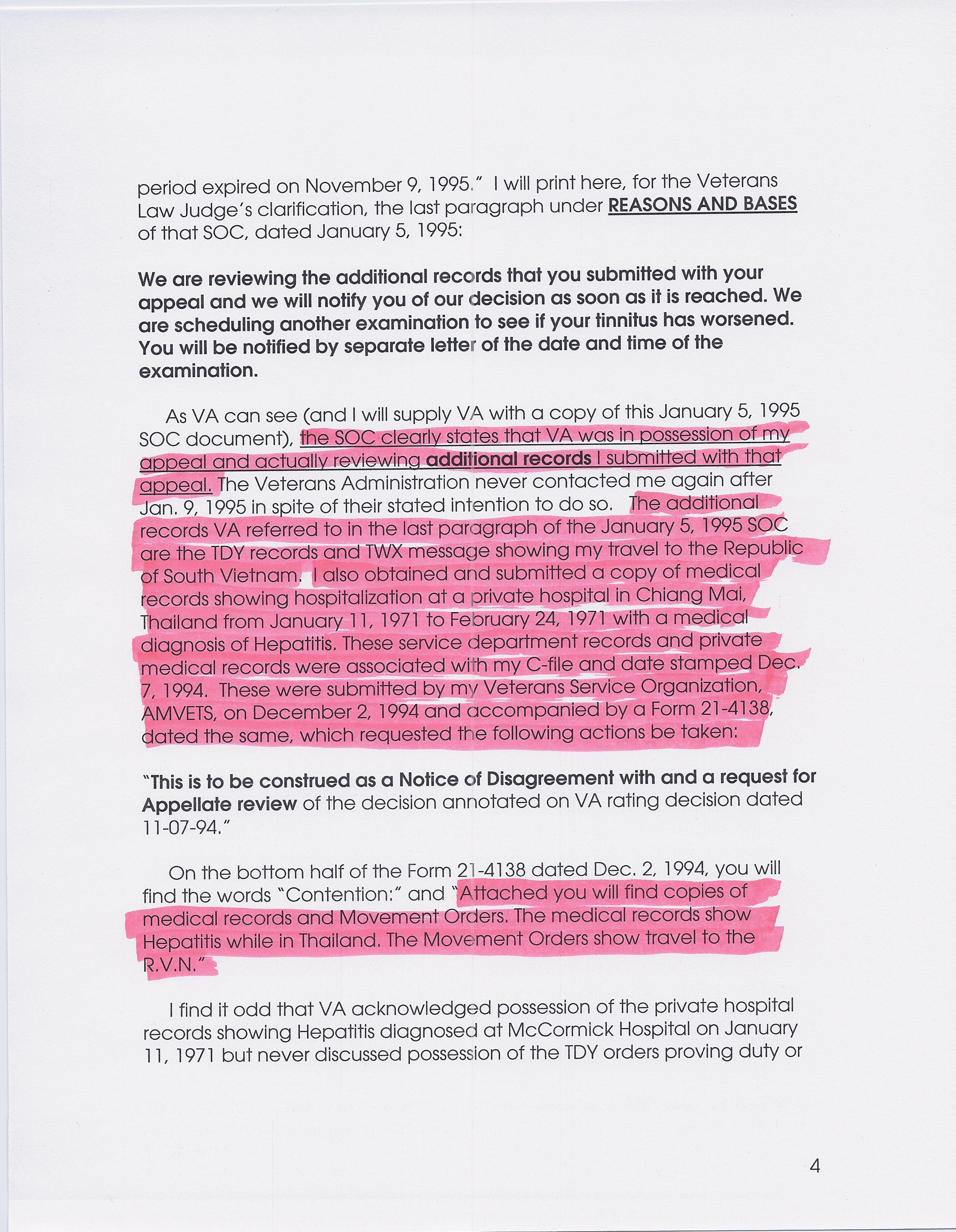 If you are blind, click on it twice and it will magnify. Now, they had all my records and the C-file shows it all. I know because I have a copy of it. Semantically, the Judge is correct in the second highlighted paragraph. I submitted nothing after the SOC. However, look at the NOD filed December 2nd, 1994: