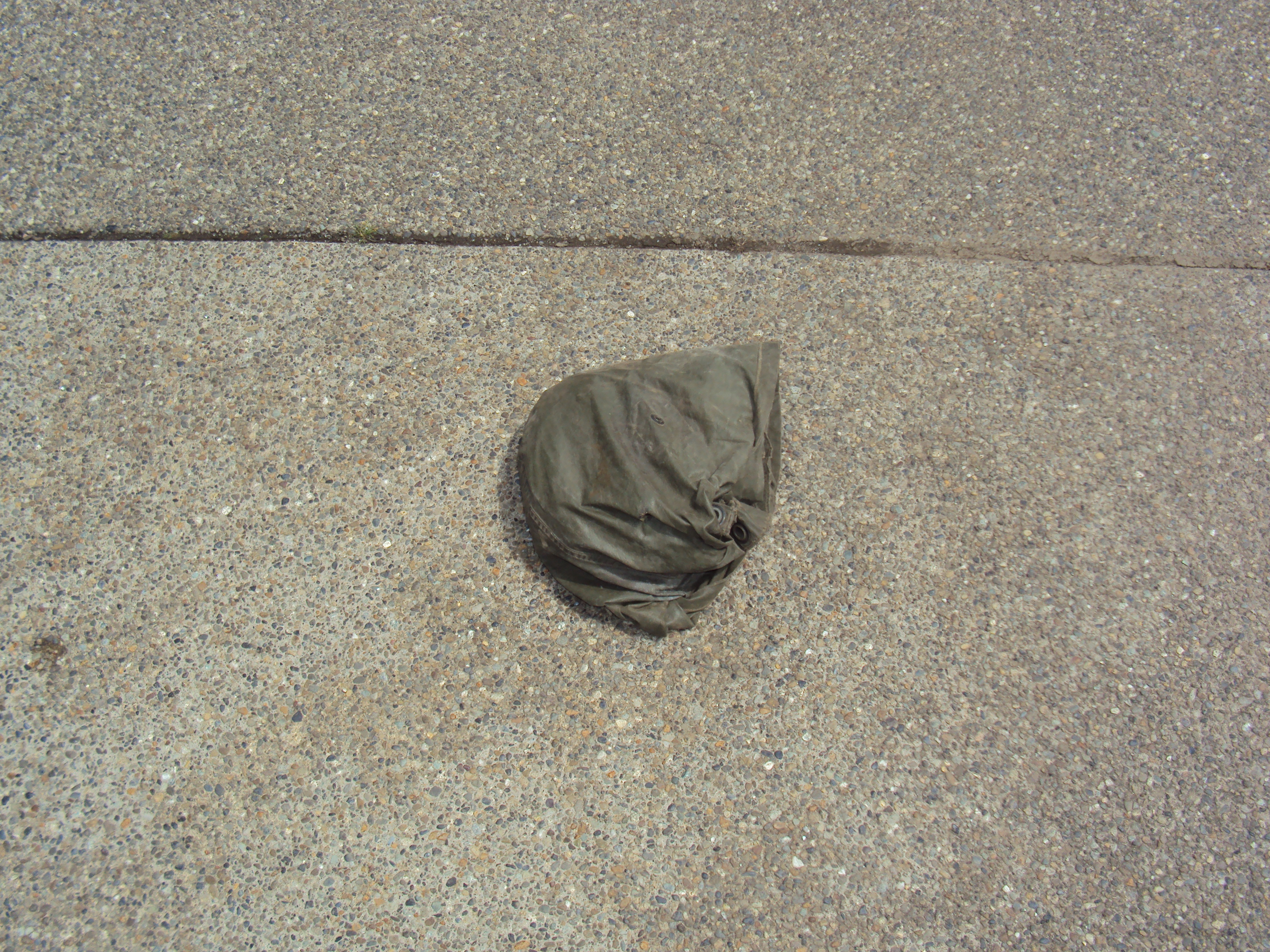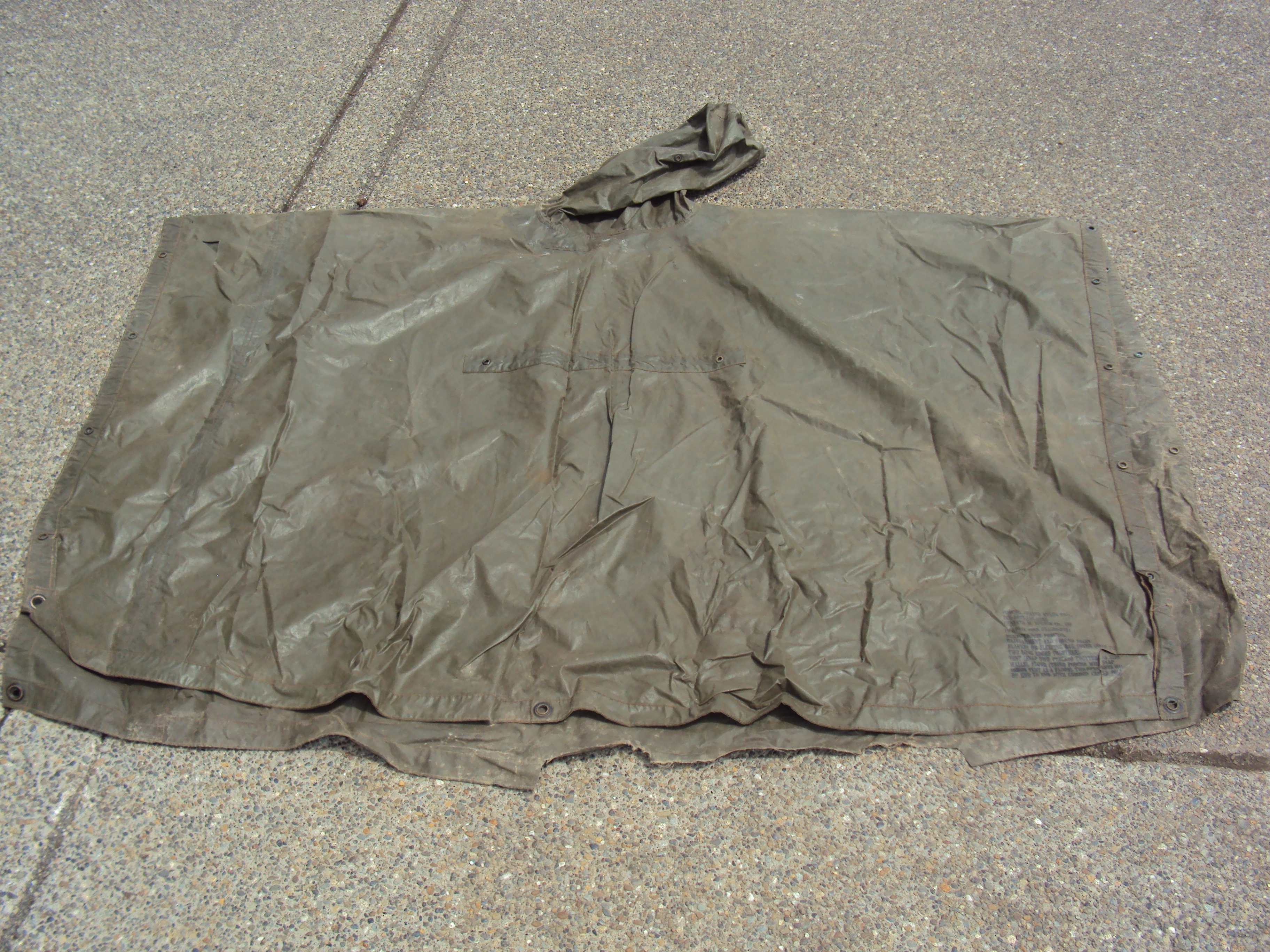 This was a reissue of a used one but was perfectly functional. I got it May 21st, 1970. It’s born on date was 19 April 1966 as stamped on the front side. It must have been in the bottom of my duffel bag when I returned. I’ve taken it up to 8.500 feet hunting in Wyoming and it kept me dry there, too. In the freezing cold, you can light a propane torch between your feet and make a miniature hot house. Combine three and make a tent with a floor.