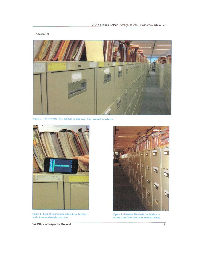 Busted. Not ADA compliant. Disabled, wheelchair-bound Vet employees couldn’t negotiate these aisles nor could they climb ladders to get on top of the cabinets to access the rearmost claims piles files. As usual, more more clarity, simply hold the cursor on the picture and click twice for a birds-eye view. Magnification will show all.