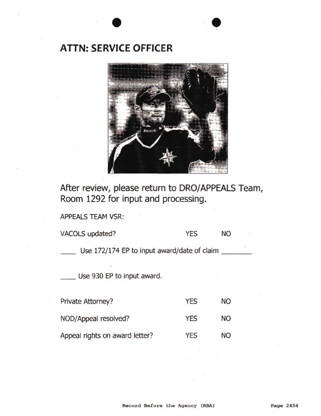 This might seem innocuous, but a newsflash is in order. I have no VSO. I represent myself. So what is some gomer from DAV or the American Legion doing roaming through my file? Why? Who gave him/her access to it? Doesn’t this bother any of you? Frankly, it makes my hair stand on end. Knowing that the VSOs are co-located in ROs throughout America, it would be easy for these service officers to roam up to, say, the unsecured sixth floor of the Winston Salem cigarette RO and peruse your files at their leisure. One hopes they would return them to the same alphabetical file pile!
