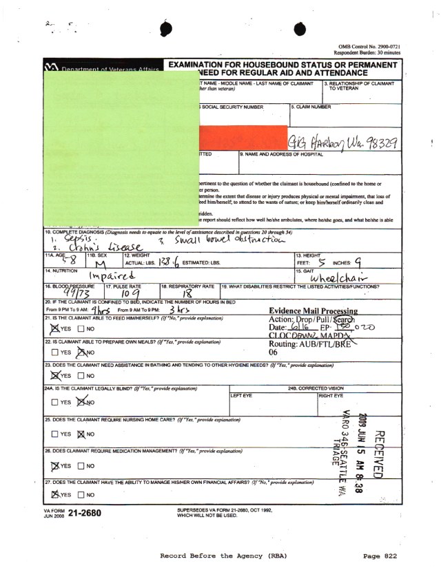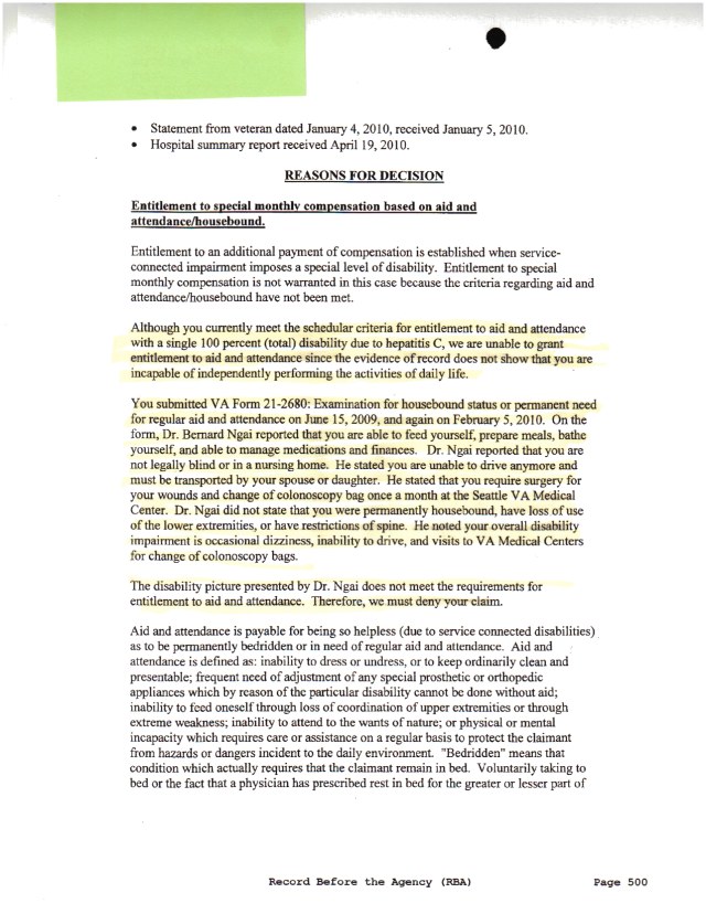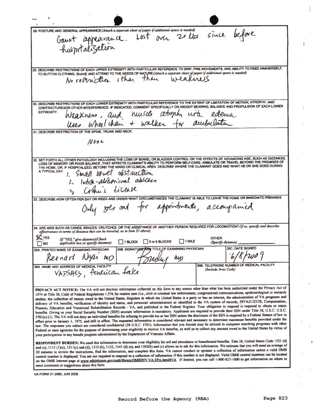 So I filed for Aid and Attendance or Housebound. Either one was fair game. Here’s what the good doctor down at va had to say about it.