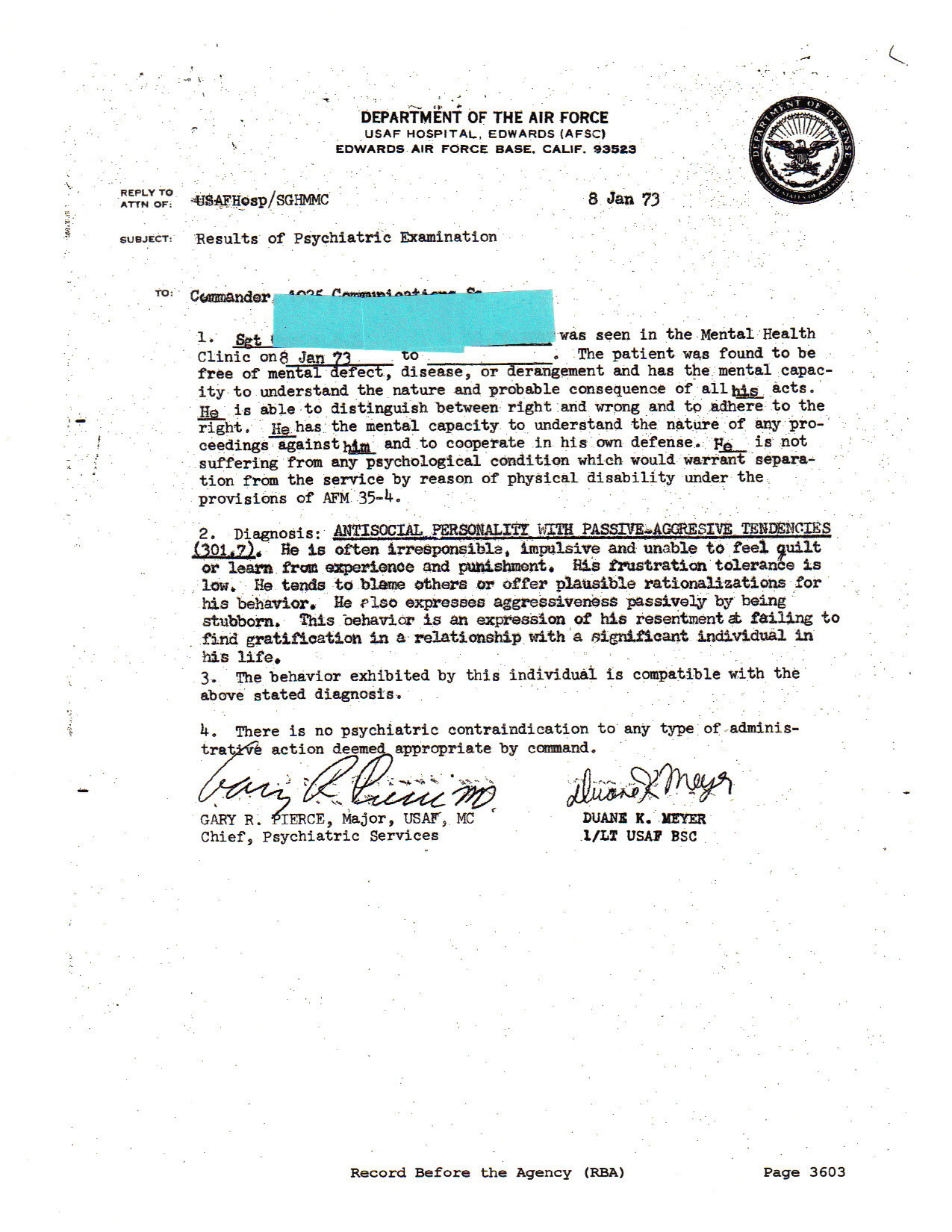 ” Here we go, Sgt. Fuentes. Ohhhhh, Bummer. 70! Too bad. Some AWOL and petty theft. Shoplifting at the Commissary. Mood and sleeping disorders. Check. Suicidal ideation? I don’t see it. You feel okay, right? Controlled by medication… hmmm. Looks like we have a little bit of PD here, trooper. How’s about a nice long, General Discharge-type vacation and a free two year pass at the American Lake VAMC for mental health counseling? If it gets worse, vA’ll reevaluate you.”