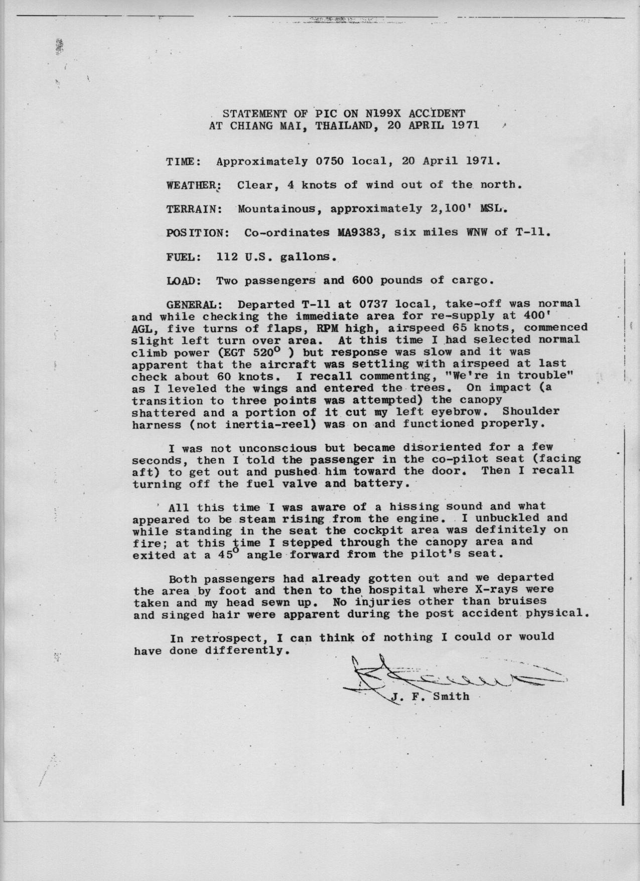 Postscript to this. Attached is Pilot in Charge (PIC) accident report I waited forty years to obtain from Consolidated International Airlines. And for the record, I don’t believe for a minute that the gentleman’s name was Jack F. Smith. We called him “JFC” Smith, the C standing for Christ. His flying technique with PC-6 Porter aircraft left many of us underwhelmed.