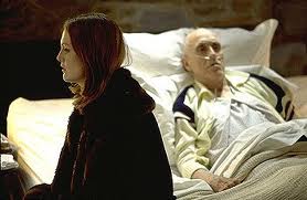 When he feels the last act beginning, he motions for her to lean in closer. She holds her head closer to hear his last wishes.