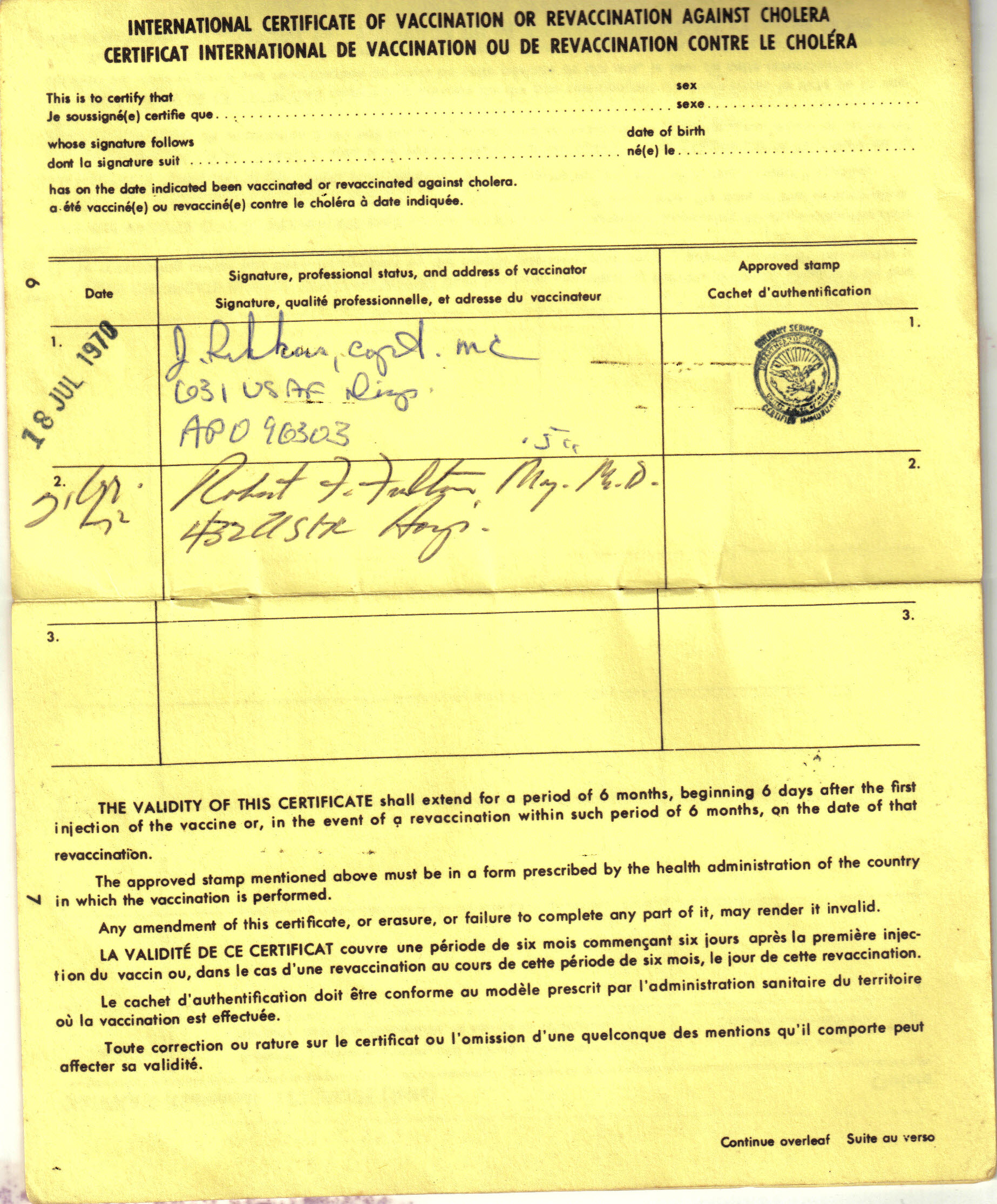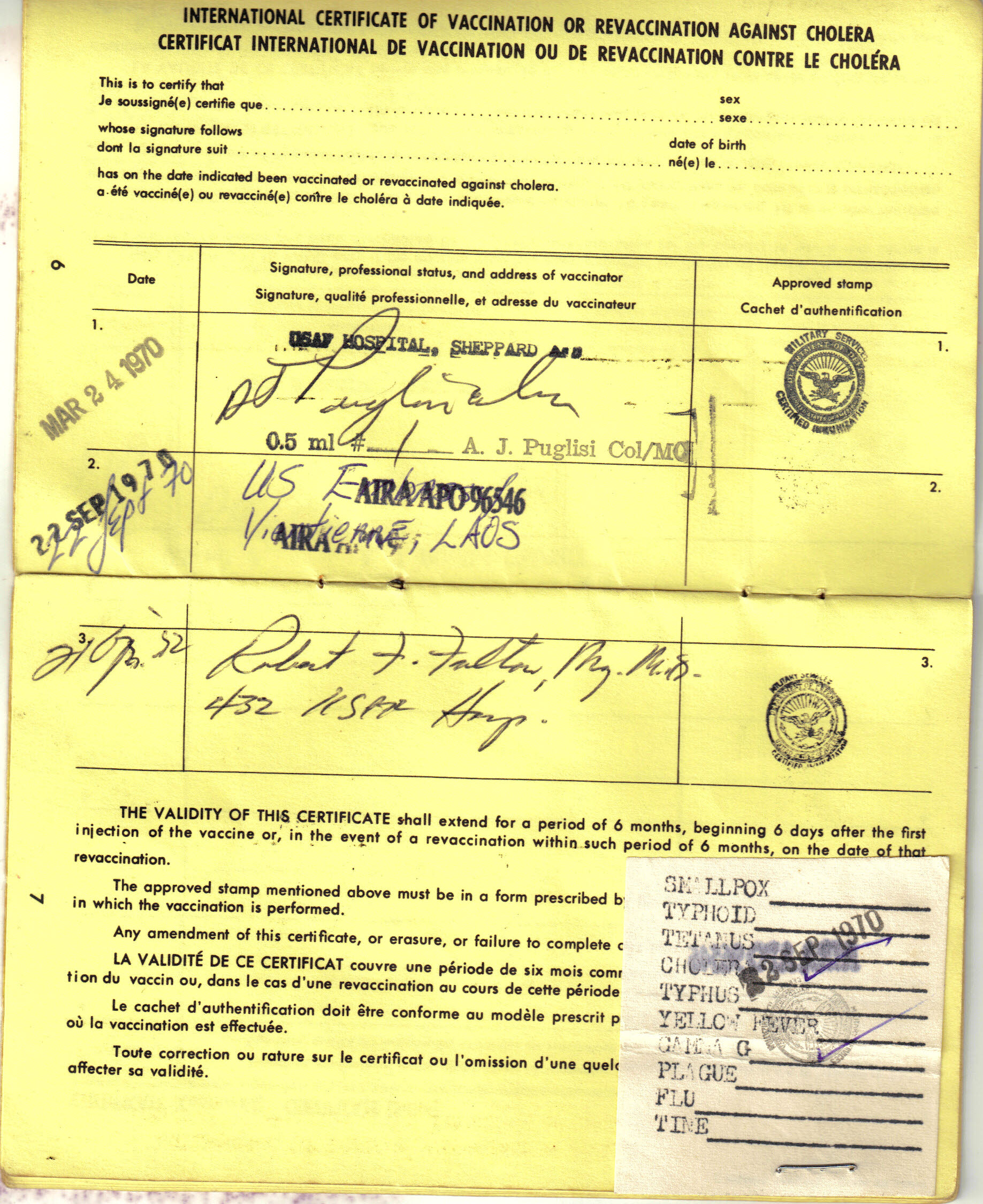 The below will show you just how brain dead I was about hauling that book around. I probably hold the record for the most cholera shots in two years during the war. The March 1970 shot was at Tech training at Sheppard AFB in Texas before departure. The July 1970 one was as mentioned above. The Sept. 1970 was due to my little yellow book being in Vientiane, Laos while I wasn’t. The Flight Surgeon at 20 Alternate, in his infinite wisdom, decided I needed another one after my transfusion just to be safe. That’s what the little white doomoflotchie is all about. I misplaced my second book and had to get yet another up country in April of ’72 because I guess they wear out or expire. The Flight Surgeon also plugged me with another Gamma Globulin shot to protect me from the hepatitis (b) I came down with 89 days later. I think this conclusively proves beyond the shadow of a doubt Gamma Globulin was worthless.