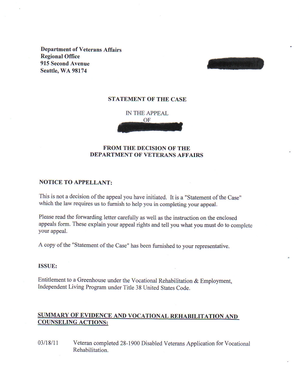 My good friends at the Seattle VR&E office have finally received their marching orders from the DC overlords. In what appears to be a case of scarce judicial resources, they gave up on a local attempt to rebut my NOD and sent it out to the cleaners. I will grant them this. They are speedy and must be employing the VBMS. I have never seen a Statement of the Case (SOC) issued in such record time since my filing in 1994. At that time, a NOD filed on December 7th, 1994 was answered with a SOC on January 9th, 1995. This one was a close second in that the NOD was filed in October 2012 and the SOC arrived last week. It took me a few days to digest it. For a while there, I thought that they had me confused with another Vet. After finding all those other Vets’ records in my c-file, I was positive this was the case. After reading further, I realized it was me after all. Anyone here who has been following the claim is probably aware that this is a discussion about one (1) (uno) (nung) (un) greenhouse. Imagine my surprise to read that I have not one but two (or three) greenhouses and am being greedy. I was also informed that my attempt to cheat local merchants out of their due by growing my own veggies ( and flowers) is right out. Apparently I can’t use the Independent Living Program to skirt paying the local truck farmers. My Form 9 will have to include a Miriam Webster dictionary definition of what constitutes a “greenhouse”. I have often talked here on the blog as well as in my book about how VA uses the written word to “bend” the meaning of things. Nowhere is that more evident than their latest opus. I include the decision here for those who will follow after me on this quest. When the battle is won, a clear path through the wreckage will emerge.