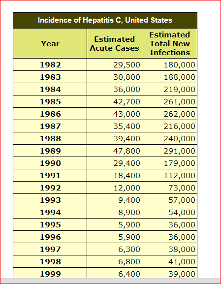 For example, look at a CDC chart of new acute cases of HCV. We see that the numbers dropped rapidly after 1990s when the DOD withdrew jet gun injectors, the blood-supply and blood products became safer, and other medical interventions became safer.