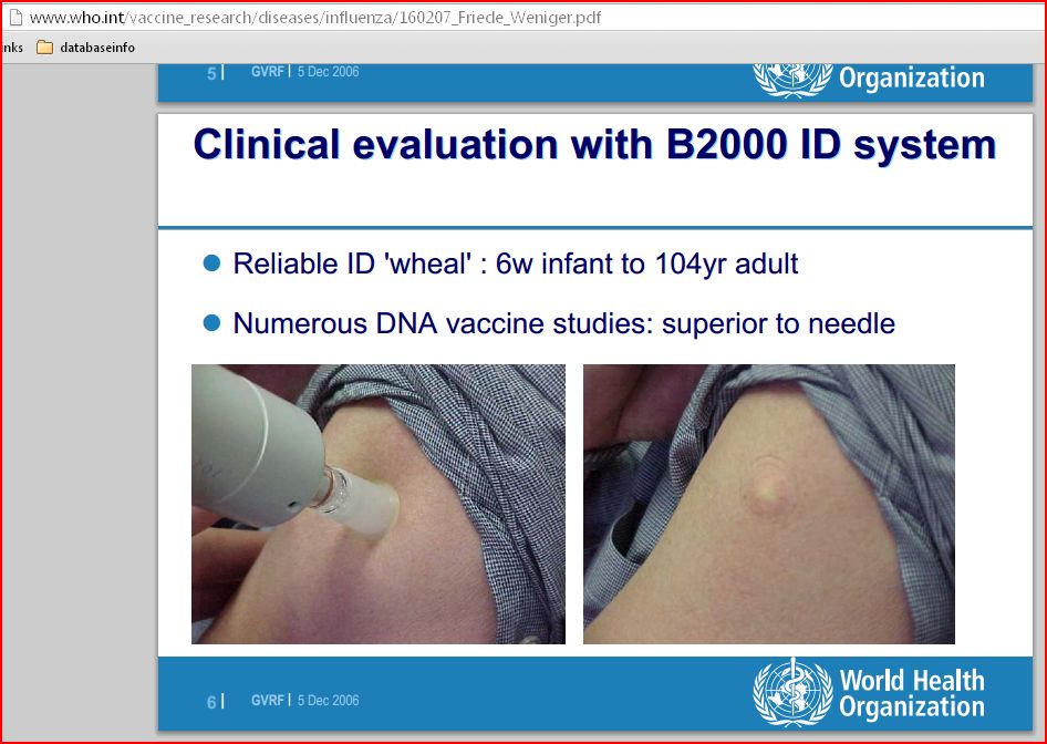 These slide images are not in order. They show the WHO website URL and are from a presentation–probably 2006. Yup, they’re still trying to sell the new improved disposal cartridge jet injectors (DCJIs) for ID vaccinations for flu this time. I can understand the desire to reduce needle-sticks to healthcare workers and the reuse of needles which cause infections, but even those with disposable spacers/cartridge may not be as risk-free as single dose, single-use syringes.
