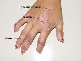 I have extensive hypopigmentation, also referred to as Vitiligo. Some know it as Michael Jackson disease. It’s all the white areas that occur in former scarred areas. Few know that PCT also makes the skin very fragile and susceptible to mechanical trauma. Simply smacking  a hand against a sharp board will open it up like a knife slice. The scars are often permanent as we get older. I look like Frankenstein I’ve cut myself so frequently. VA examiners can’t seem to “see” it during a C&P exam.