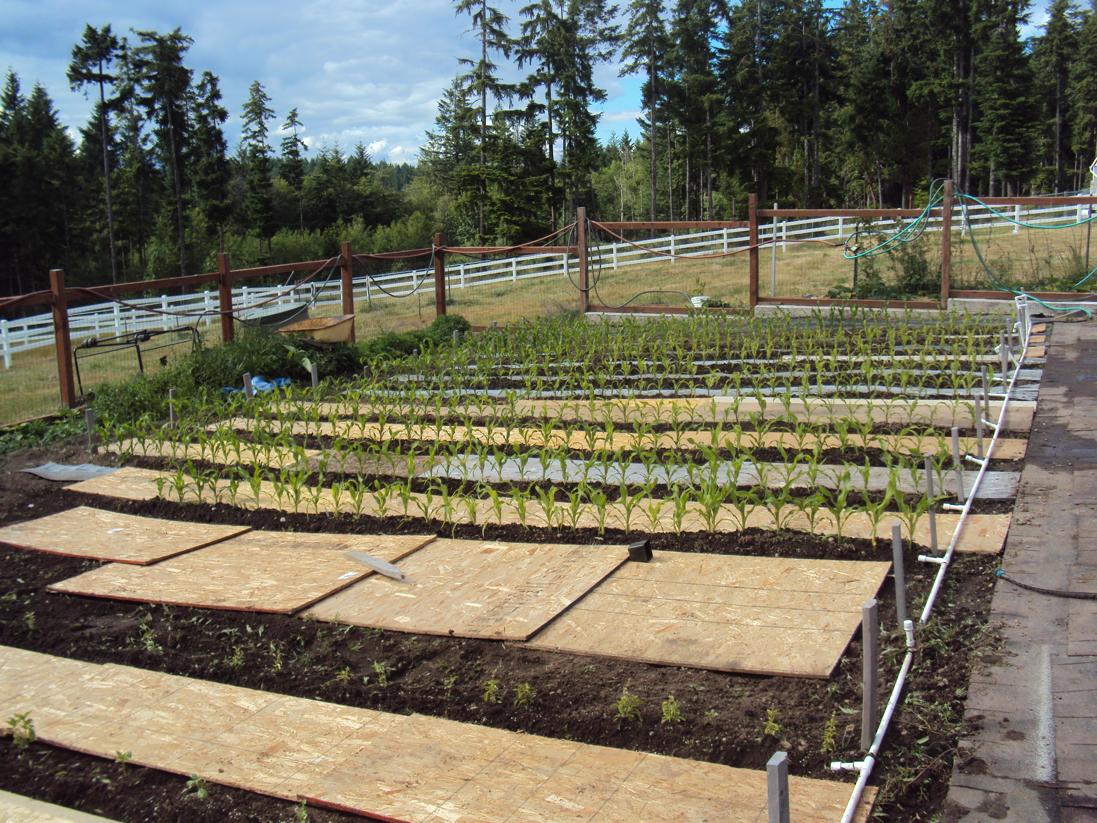 I prefer the dark colored carpet method to keep weeds away while warming the soil and carpet breathes better than plywood! My Candy Corn, Bodacious are usually ready for picking around mid July.