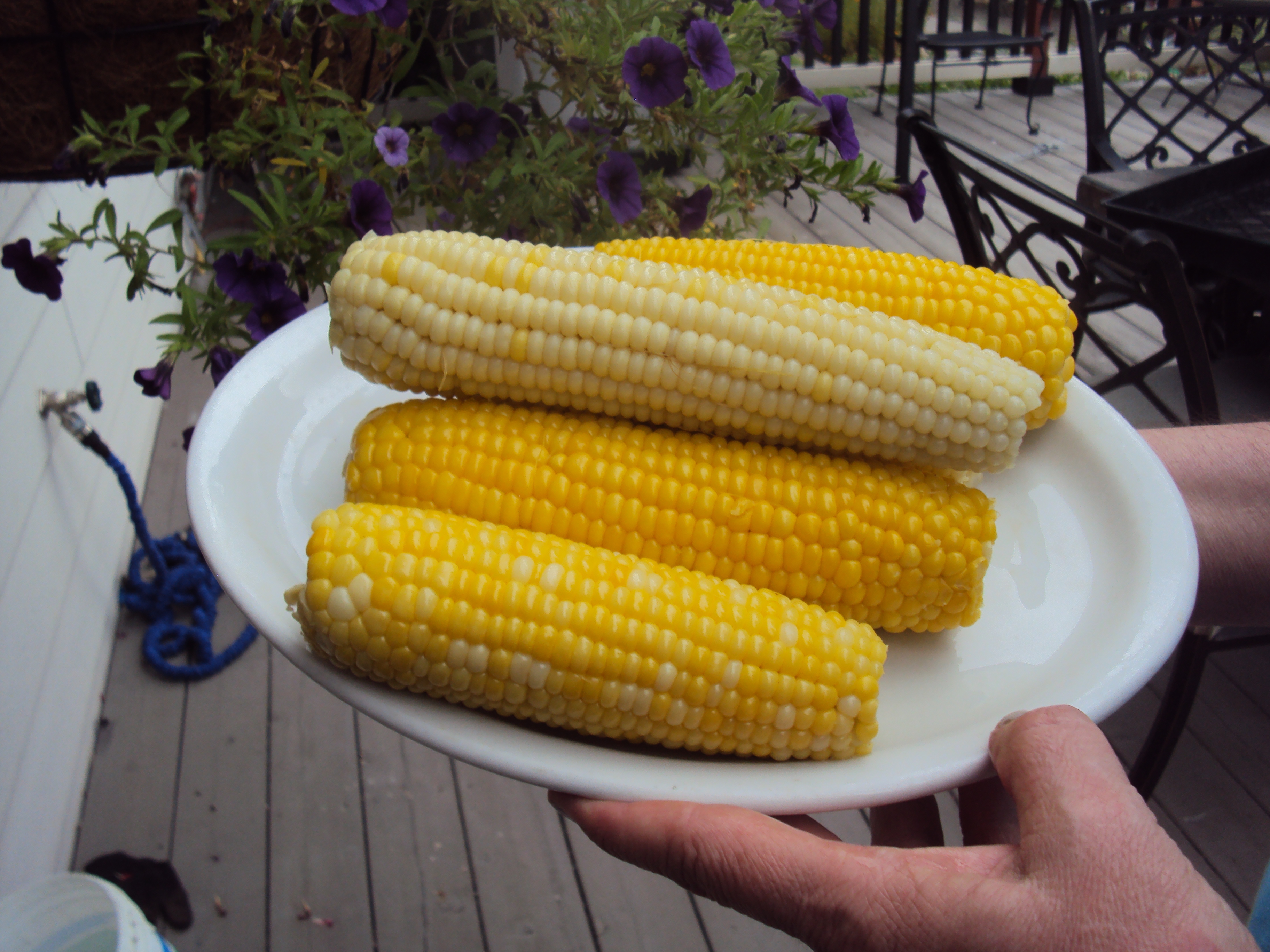 Above is the Silver Queen on top, flanked in front and behind by Jubilee. In the foreground is Peaches and Cream. Underneath the Silverqueen (invisible) is an ear of Kandy Korn. Fukushima has been berry, bery good indeed. As for those yellow kernels in the SQ, with as many flavors as I have in the garden, it is no surprise. They were invisible until we cooked it.