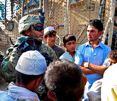 “U.S. Army Capt. Steven Pyles, of Fort Washington, Md., troop commander, 4th Squadron, 9th Cavalry Regiment, 2nd Brigade Combat Team, 1st Cavalry Division, speaks with local residents during a counter indirect fire patrol near Lalmah Village, Chapahar District, Nangarhar Province, Afghanistan, Sept. 1, 2013. Pyles’ Soldiers, working in support of Task Force Patriot, gathered information allowing International Security Assistance Forces to limit potential indirect fire sites around Forward Operating Base Fenty.”