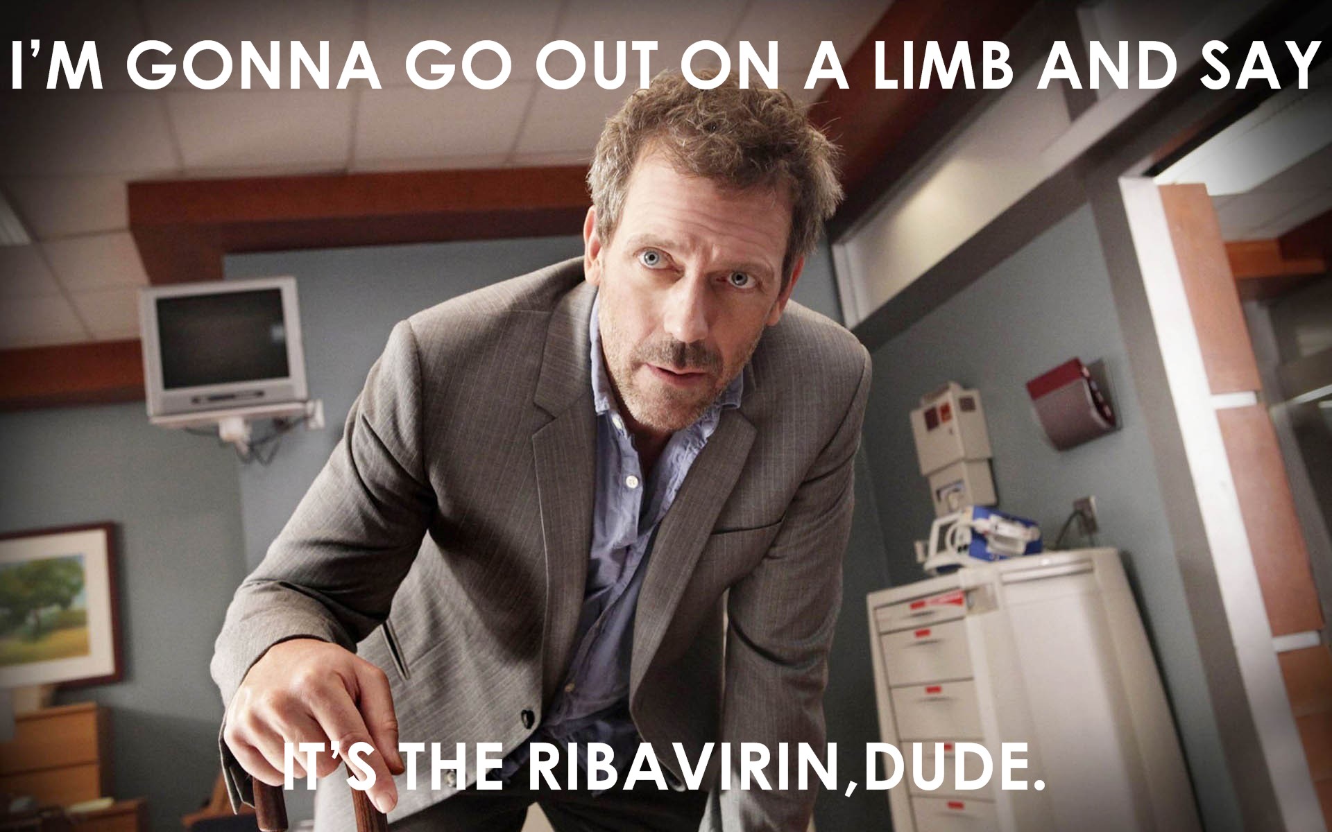 Next, I am becoming anemic. Not just a little anemic but a lot. The monogram on Ribavirin says “May cause anemia”. My Sovaldi minder (Mariah) at the doctor’s office called last Friday and said “Hmmmmm. Seems your getting a leettle anemic. I wonder what’s causing that? Let’s try something here. I want you to take one less Ribavirin a day henceforth. That would be four tablets instead of five a day. Can you remember that or should I send you a letter?” Wowser. Where did you park the ambulance, Dr. House?