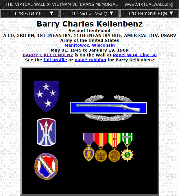 Butch’s A Company had two Killed In Action (KIA or KHA (killed by Hostile Action)) on the report) and eight Wounded In Action (WIA or WHA on the report). 2nd Lt. Barry Kelendel was his Platoon Commander however they misspelled his name. It’s Kellenbenz. He was KIA and his military record is available on the Virtual Wall. The second was PFC David Balzarini. He, too, was KHA on the 19th of January 1969 according to the Virtual Wall. You will notice that on both pages the Combat Infantryman’s Badge is prominently displayed as an award-undoubtedly posthumously. I firmly believe Lt. Kellenbenz and Balzarini qualify as “fellow Veterans that he served with” who can plead his cause. Sometimes voices from the grave speak more loudly as they are asked to here.