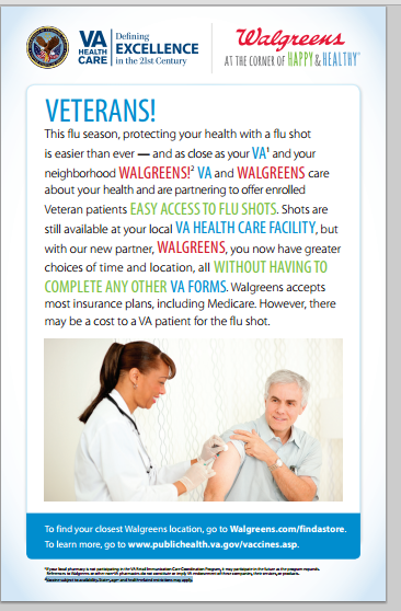 Oct. 6 VA Press Release: Veterans, you may be able to get your flu shots from Walgreens pharmacists nationwide this year. I just called a local Walgreens to see if they were participating and they are!