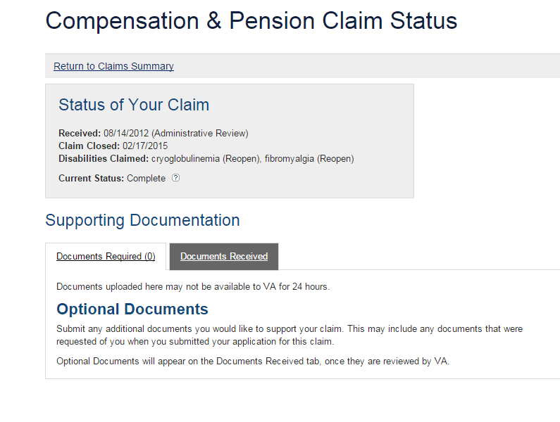 Above, as you can see, after 28 months in “Administrative Review” purgatory, something is afoot. When you file a Writ, everything begins to occur at lightspeed. There is no time to leisurely move the claim through its appointed rounds to the final stage. Here, in blue, I found my claim relegated straight to the completed file with no explanation. It merely said it had been closed as of 2/17/2015. The two requests for my c-file and my VR&E c-file are still pending in red above it and have gone nowhere since my filing in Cheeseville Wisconsin last fall.