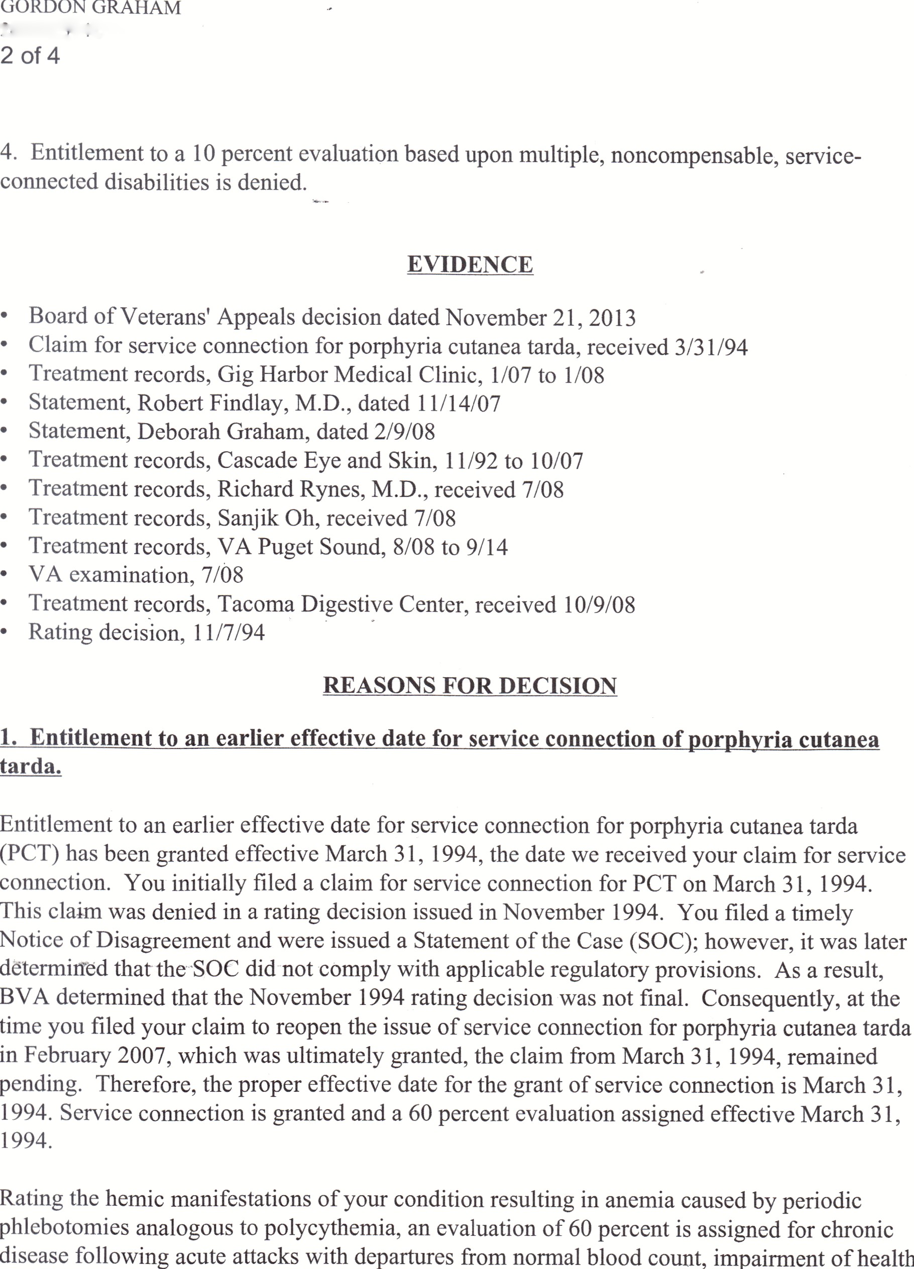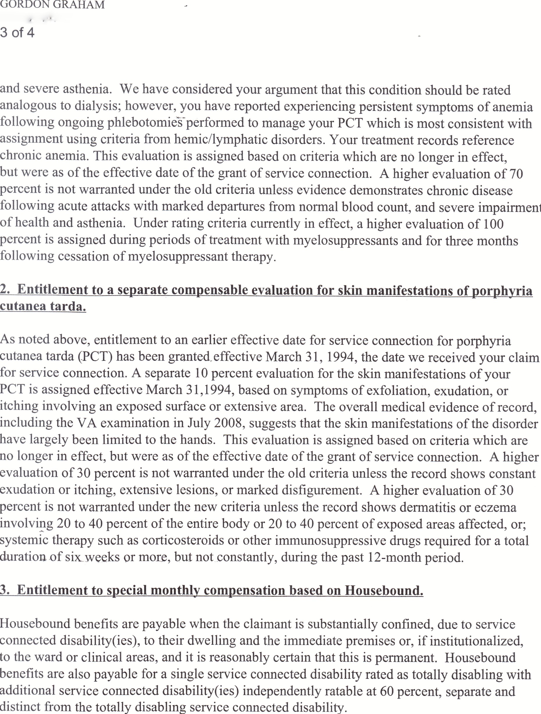 We now enter the fourth rating decision. I would call the initial denial in November 1994 the first. That was the “You were never in Vietnam” decision. Yesterday’s rating now rectifies the 2010 CUE by restoring my paltry 10% for the Porphyria but forgets the deleterious effects of photosensitivity, mechanical trauma and extensive scarring again. Offering 60% for the phlebotomies based on anemia is a new, straw man argument. Once again, VA pulls out their empty pockets and states they are ratings -limited due to the language in DC 7704. Poor Mr. Graham is not entitled to total disability because there is simply no language there to cover it. It’s 60% and that’s the law. Throwing in the 10% is a doggy bone to them. It accomplishes nothing. The argument tries to encompass the idea that they also considered the regulation in 1994 as written. The law says if the regulation changes during the pendency of a claim, the rating most advantageous to the Vet must be employed. Yeah, right.