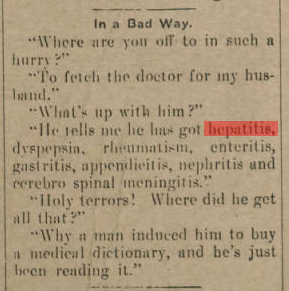 “He tells me he has got hepatitis, dyspepsia, rheumatism, enteritis, gastritis, appendicitis, nephritis and cerebro spinal meningitis.”