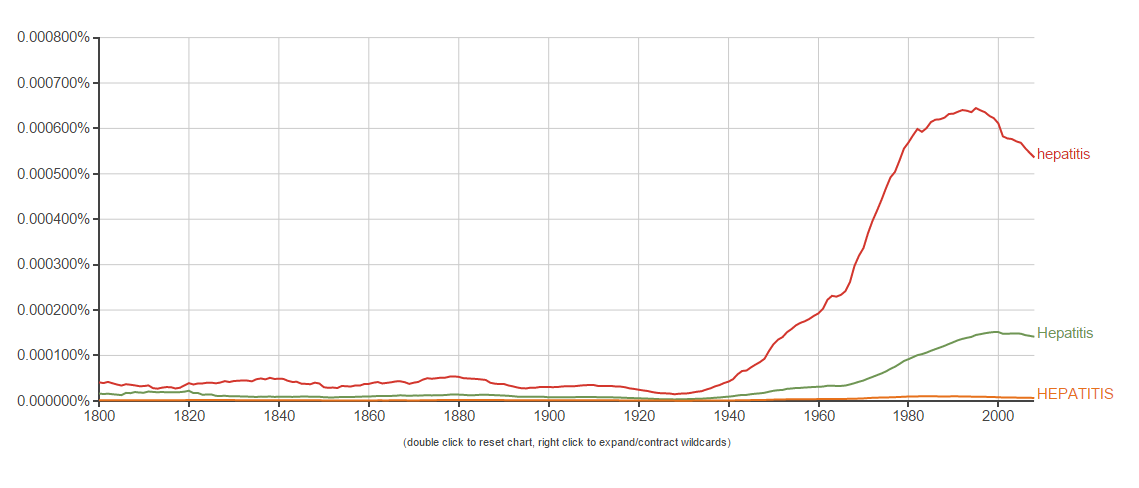Google’s search for the word hepatitis in BOOKS shows that the mentions begin to rise in the mid-30’s and takes off in the 1940s as a hot topic.