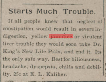______________________________________________________________ Gee, folks with virulent liver trouble had it made in 1911–only 25 cents for Dr. King’s New Life Pills.
