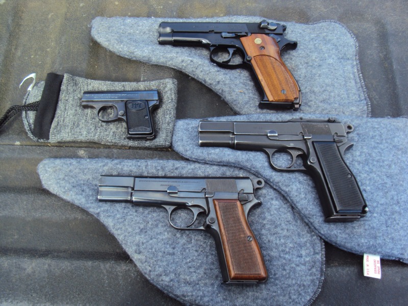 In order from 12 o’clock, S&W Model 39 9mm USAF Survival Issue 87XXX, Inglis Hipower 9mm, Browning Hipower 9mm 118XX, Browning .25 200XXX.
