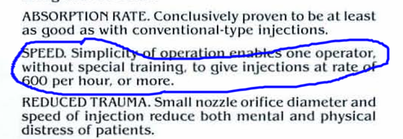 This manual is useful for all you NOVA lawyers to access to rebut the presumption of regularity of medical practices that the high standards of sanitary inoculations were not followed. Hell, the usage of the gun in thousands of “yearbooks” shows jetguns being used one-handed or at an angle oblique to the skin rather than a perfect 90 degree angle in both vertical and horizontal planes as demonstrated in the manual.