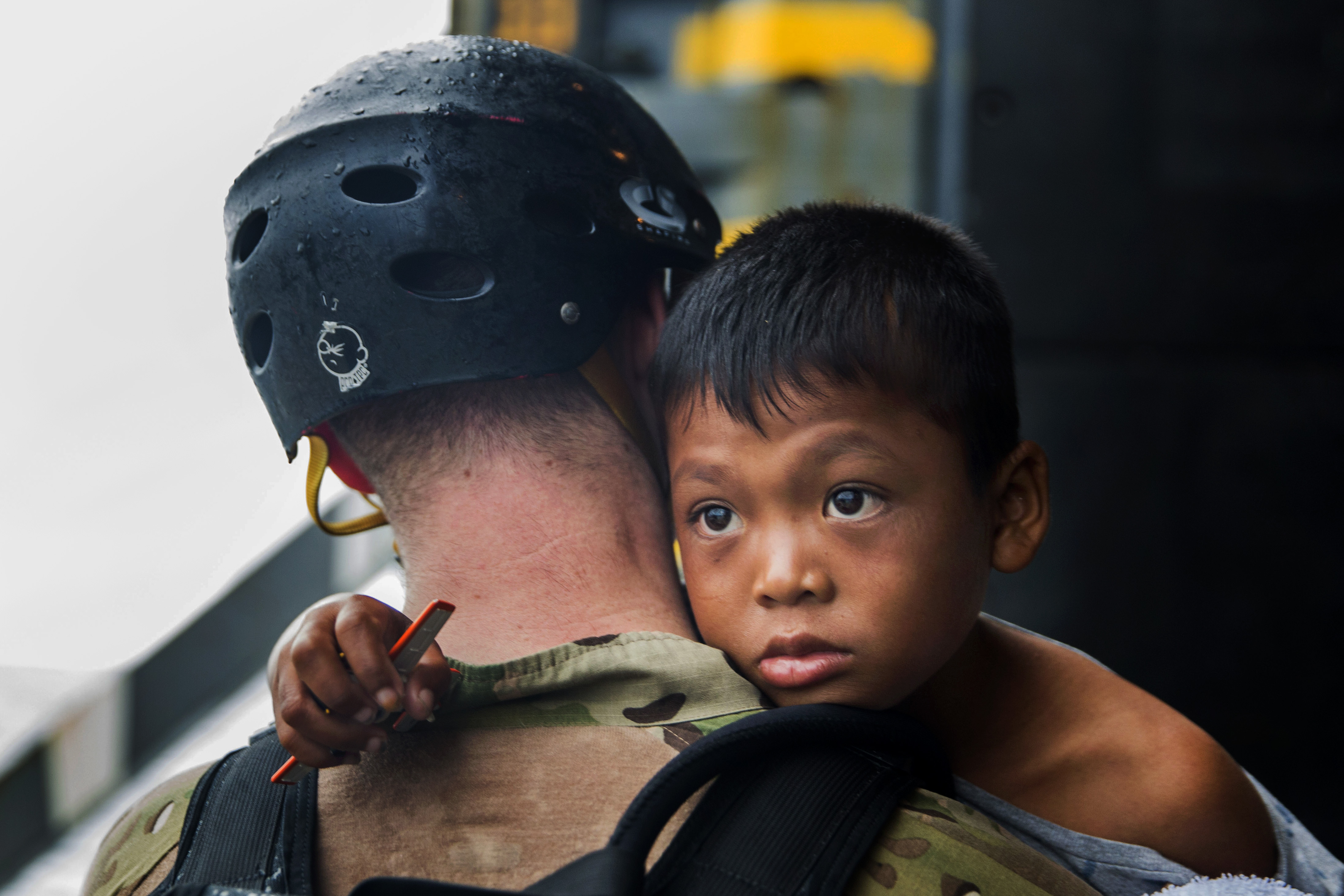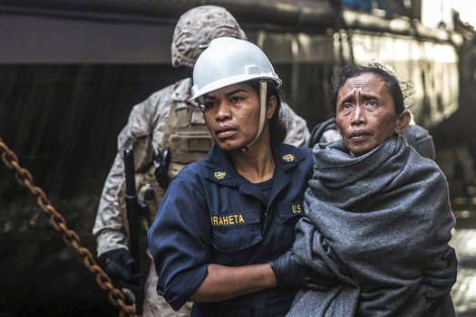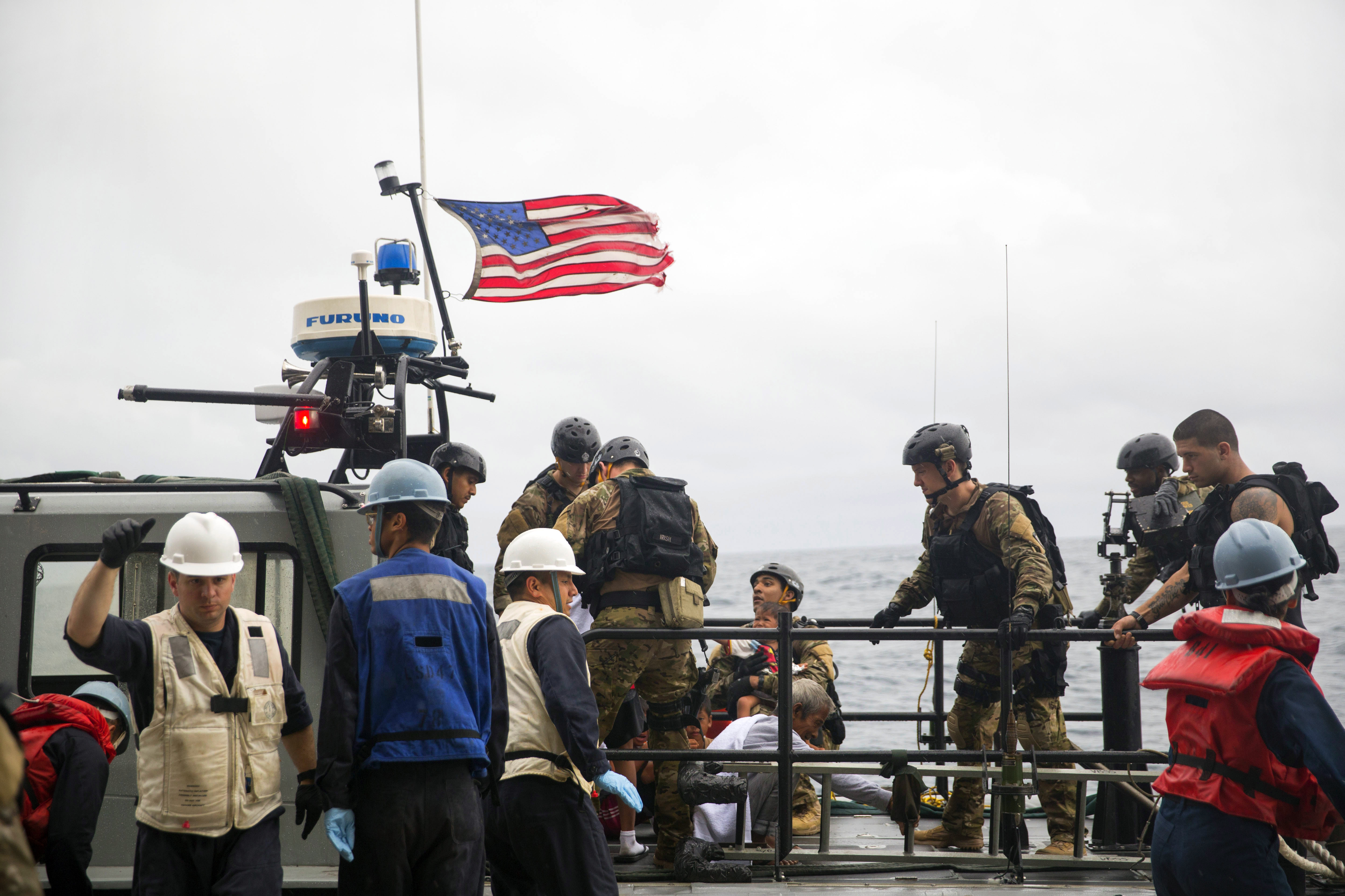 “A U.S. Sailor with the Essex Amphibious Ready Group loads an Indonesia boy onto a watercraft to be transported to an Indonesian coast guard vessel from the USS Rushmore (LSD 47) in the Pacific Ocean, June 11, 2015. ” (U.S. Marine Corps photo by Sgt. Emmanuel Ramos/Released)