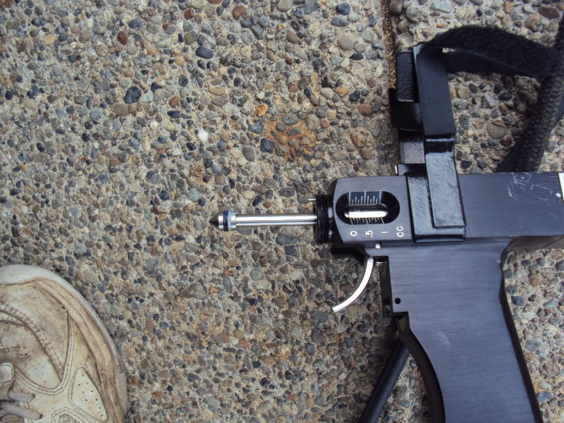 Mark and I had the devil’s own time figuring out what was wrong with the gun. Try 40 years of inaction. The reservoir for hydraulic fluid was empty in the foot pedal. The o-rings were drier than the NASA Challenger’s. and the nose orifice was plugged-probably with 40 year old blood.