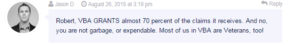 Scanned-image“Hey, my name’s Jason D. and I’m one of you, guys. VA loves you.” In what alternative universe paralleling ours does the VA grant 70% of claims? True, they do eventually after a ten-year fight but I’m the 21-year old poster child on the telephone pole that refutes this. Butch is now the Poster child for HOW they deny you-in record numbers and in record time using the new VBMS technique. Here, Jason just admitted he works for the Veterans Benefits Administration and does this for a living. I wonder if VA gives him time off to come over to the Vantage Point to spew his propaganda.