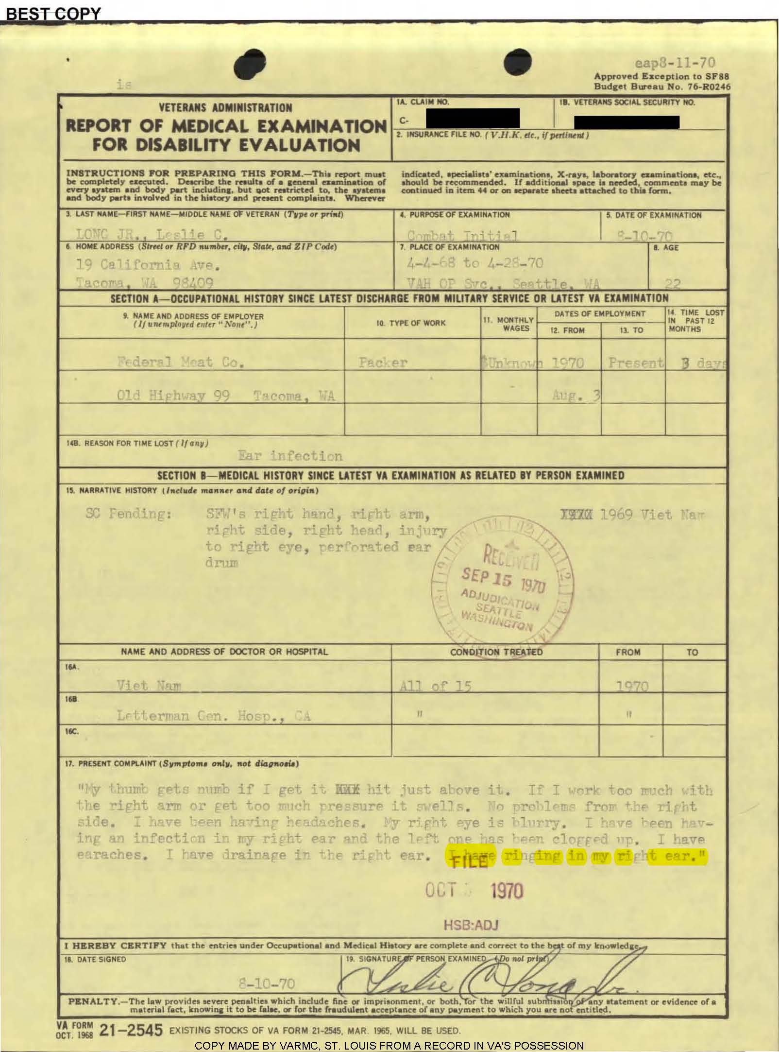 Evidence is king. I tell you that over and over. You construct it like a concrete foundation. All the documents below are originals. Left clicking on them will magnify them for you. Left clicking on them twice will really magnify them for those of you who are blind like us old farts. You have to begin with an entry physical showing good hearing when you went in. Like this: