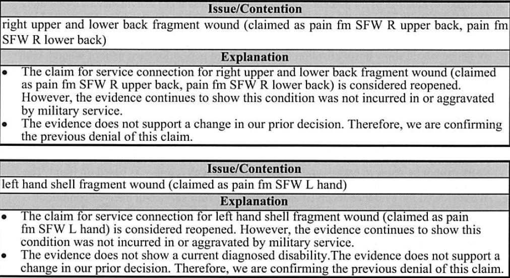 Most importantly, both of these decisions concern older Veterans and the laws in effect at the time. Oddly they have not changed in the least. This saved me a lot of time in looking up what the regulations were in Part 4 concerning the law on penetrating wounds. Mr. Beyrle was a guest of the Germans in a POW status when he was shot through the upper right chest. Mr. Myler served in Korea and was shot through the upper thigh. While both these decisions involved through and through GSWs, they give us an excellent education on how VA is obligated to adjudicate a penetrating wound claim. More importantly, from Mr Butch Long’s experience, the decisions teach us how the VA is required to view shell fragment wounds -and most especially SFWs with retained metal (foreign) bodies (shell fragments).