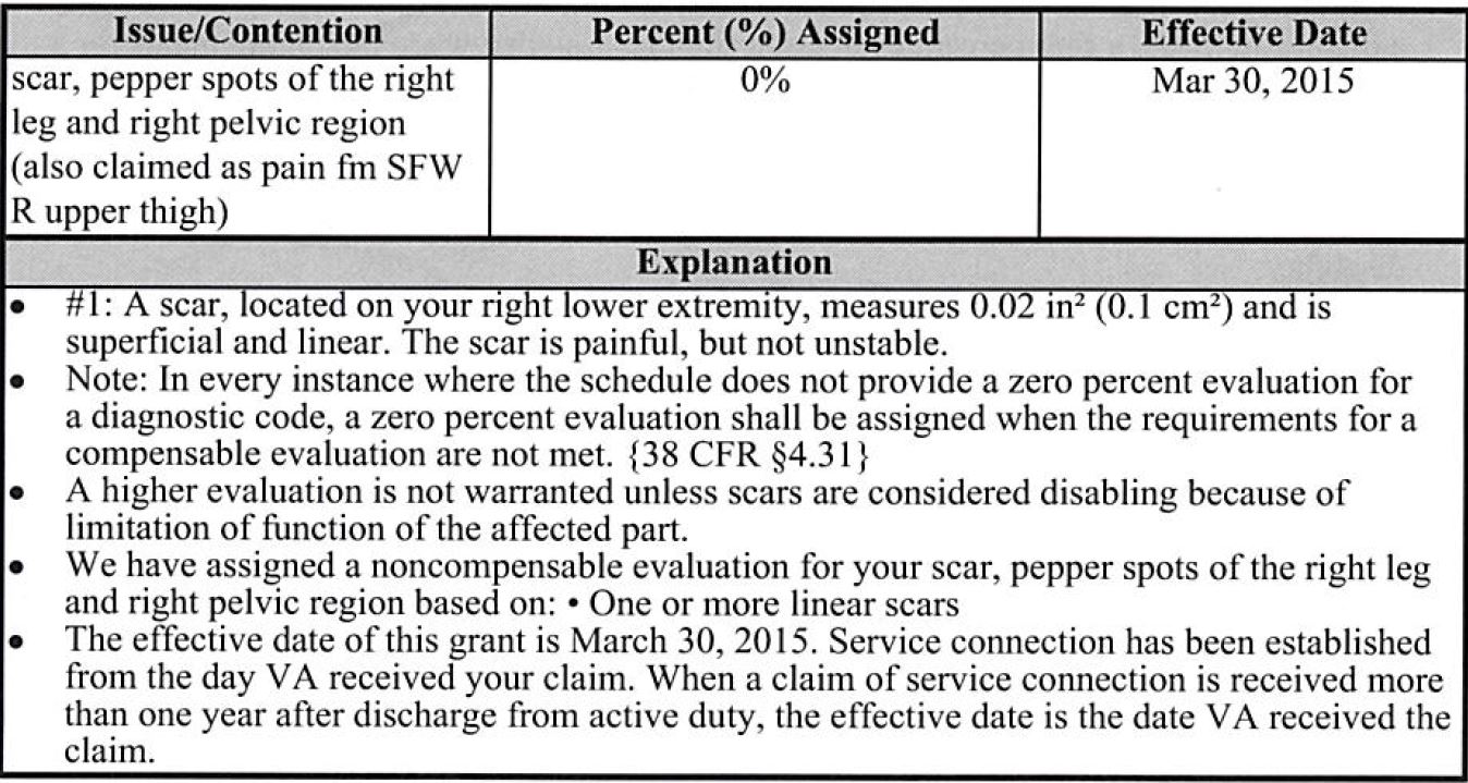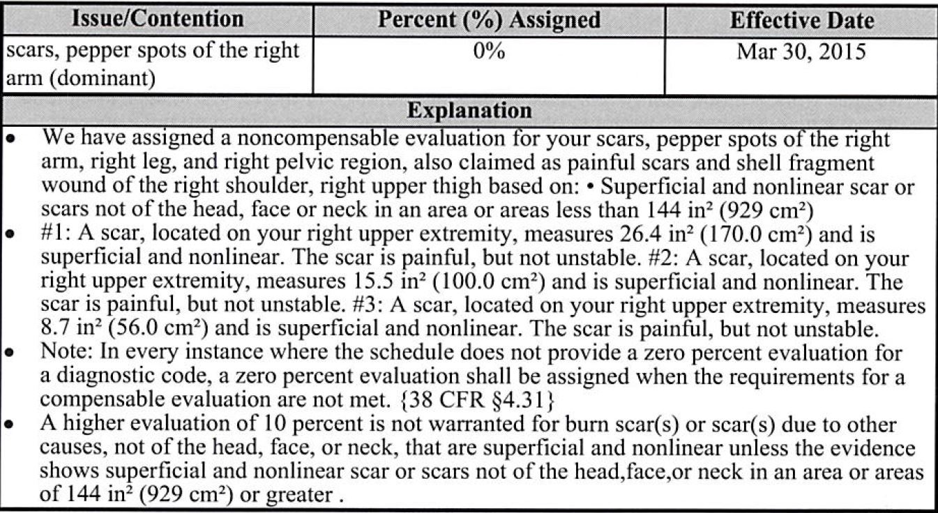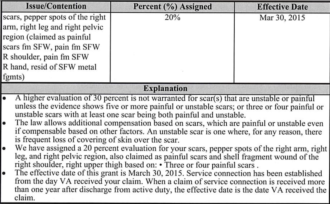 Please note it doesn’t say “deep” or “requiring proof of muscle debility”. All that is required is what Butch survived- a very intense explosive event in close proximity that left him with thousands of small retained foreign bodies. And in 1970 they gave him 10% for scars to the right forearm ( DC 5308-moderate) as well as 0% for “scars, pepper spots” rt. arm, rt. leg and rt. pelvis (DC 7805 scarring). All these injuries are to the dominant side (right). When reapprised of these injuries in 2015, the rater (remember good ol’ boy  GS-11 Frank Idiotzakowski above) decided to be slightly more munificent than the 1970 rater but ignored the explosive effects codicil. With Myler/Beyrle guidance from above, how could this happen in 2015? Gee, I give up. A vast right wing conspiracy in Seattle? Can we blame it on Bush?
