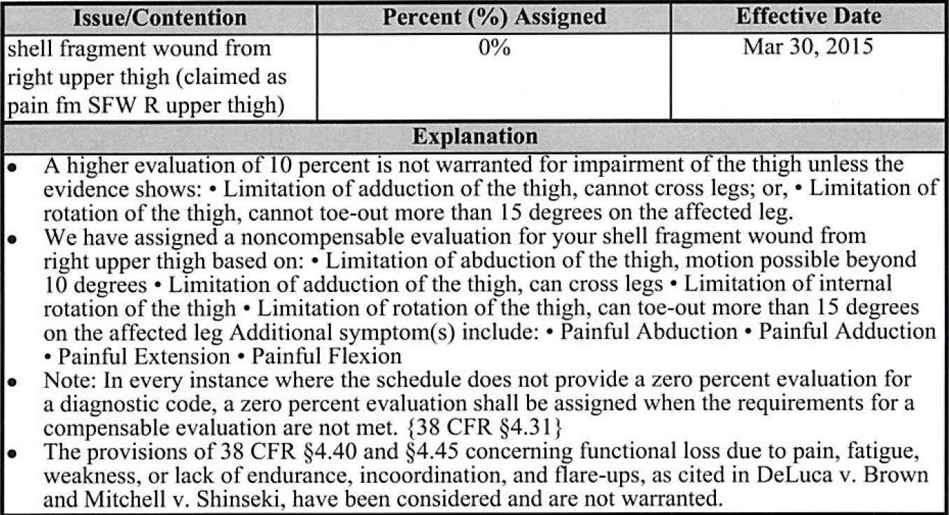 The sum of the errors is stupendous. Because the injuries to the right forearm and hand are the dominant side, the force multiplier is employed. Add in the interconnected MGs of the head, neck, back, shoulder, forearm, pelvis and the hand and they are moderately severe. Add in the explosive effect causing the presence of numerous minute fragments (pepper spots) dispositively documented and the rating is required to be severe in any MG exhibiting the pepper spots.  This is how VA does the bait and switch. Pepper spots? So what? It just looks like you didn’t take a bath, Butch but that doesn’t rise to the level of compensation. Even if it isn’t dirt, they didn’t leave any scars and they aren’t painful. 0%, 0%,0%, 0%, 0% and 0%. Did we miss any? If we did, they are also a 0%. This is the wrong metric to analyze the injuries with. VA knows it. This isn’t so much about pain as in DeLuca vs. Brown (1995) -or scars for that matter- except in the two areas Butch identified in 1970. Yes, pain on motion has spread  and they remunerated him for that (barely). They are purposefully whistling past the graveyard and hoping Butch will forget the pepper spots.  I guess I could go Shakespeare here (“Out, Out Damned Pepper Spots!”). They gave him TDIU which is  Butchslap # 26 in a series of them. And then they told him to get lost…and he’s in a wheelchair.  Read ’em and weep.