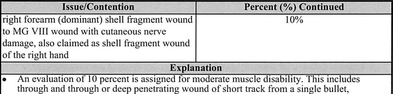 In Brian’s case, the Court clearly saw and pointed out that the 1953 evidence was unequivocal-that the bullet traversed two MGs -13 and 14. But what was worse was they ignored almost all of what is still summarized in §4.56 then and today. Any penetrating wound was (and is) to be rated as “moderate”. 38 CFR §4.56 lists the different degrees of damage and instruct as to how to rate the wound(s). Depending on the criteria, they can be slight, moderate, moderately severe or severe. This ultimately determines the rating expressed as a percentage to assign to the wound(s). This facet is covered in 38 CFR §4.73. Additionally, if the injury occurs to the dominant side of the body (i.e. the right if you are right-handed) there are additional considerations (see §4.69).