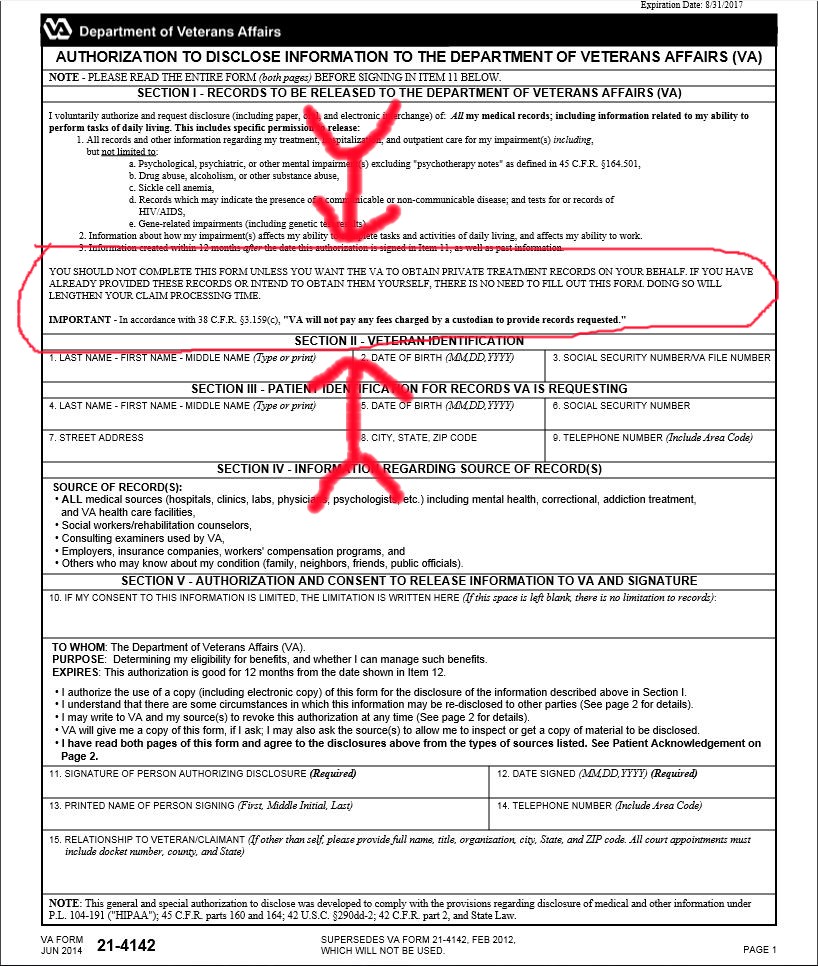 Another technique, but certainly not the last of their delay and deny tactics to throw sand in the gears, is the worst and one they have only recently discovered when they need more time to fix something horrendous. Butch Long’s claim for an earlier effective date, filed with his NOD this July, prompted this little gem. VA generally sends you the 21-4142 and the 4142a in the preliminary stages if you have not sent in any medical info regarding your filing. This automatically disqualifies you from the FDC expedited process as we know. But what happens when you’ve already sent in every last medical record in existence regarding your condition and diagnosis? What could possibly be the rationale for the raters to ask for more medical records on appeal? Well, folks, look at the VAF 21-4142 below and read what’s in the red circled area.