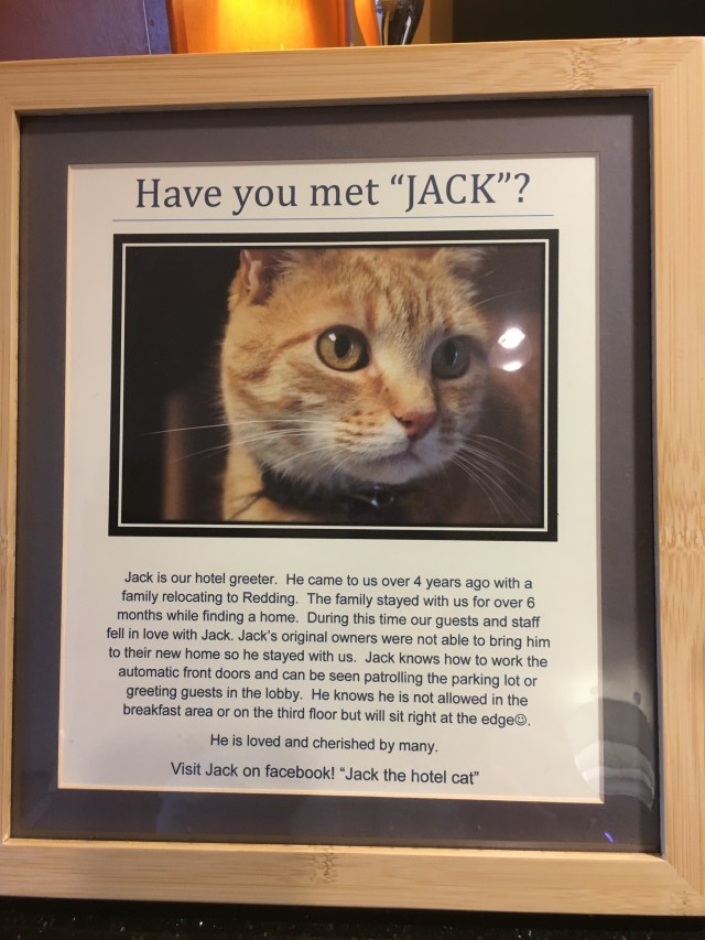 This story is our first day of the drive to San Antonio, TX for the Spring NOVA conference. We overnighted at the Fairfield Inn in Redding, California. I’m not advertising Marriott Rewards™ but they have the cat’s pajamas on their staff. Meet Harry the Cat. This is a hoot. He even has his own Facebook page. He has quite a story and as you can see by his left ear, he’s no stranger to getting in a tussle. He met us in the parking lot as I parked and showed us where the front door was. He likes to ride the baggage cart, too.