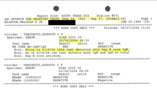 Just for shits and grins, I had him tested for HB Surface Ab and HC Core Ab in 2015. Both came back positive showing exposure or resolved Hep. B. Maybe those VA blood testing components on 2004 were expired. Watch Carmen Mascarenhas, MD moonwalk right over this HBV enigma.