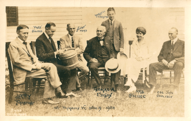 Silent Cal is an interesting character, frugal, war-avoider, a tax-cutter and cozy with Big Business. The Coolidges entertained the oligarchs of their day in Plymouth Notch; below we see Thomas A Edison, Henry Ford, two Firestones. (He is signing a maple bucket as a gift.)