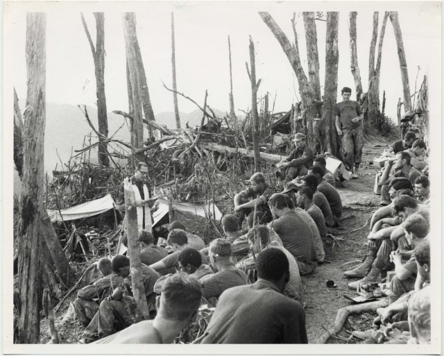 “Sermon on the Mount” “Navy Lieutenant Commander, Frederick E. Whitaker, chaplain for the Third Battalion, Fourth Marine Regiment, holds religious services for leathernecks of “M” Co., on a mountainous ridgeline north of the Rockpile. The Leathernecks were participating in a battalion-size search and clear operation near the Demilitarized Zone.” In the collection of: The New York State Military Museum and Veterans Research Center, Saratoga, NY https://dmna.ny.gov/historic/about.htm