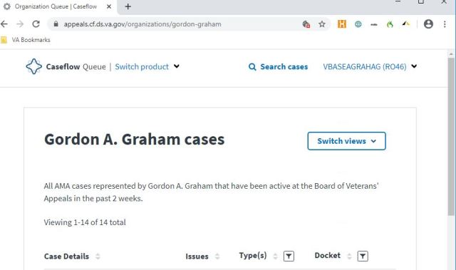 This is the entry for both CASEFLOW QUEUE and CASEFLOW HEARINGS. Just click on ‘Switch product’ to change over. Also, use the back arrow up in the upper left to exit each case so you don’t have to keep hitting the client menu to get back to the queue. I want to know what all the hoopla is about with this. You could discern far more in VACOLS. This gives us less info than the old fashioned Ebenefits back in 2014.