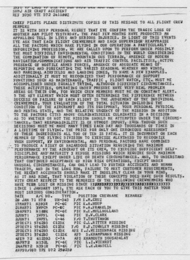 If you got shot down, it was an aircraft “accident”. The “customer” referred to above was our titular head-  Consolidated International Airlines (CIA). Our actual boss was called the “Controlled American Source” or CAS. Well, actually he was called a number of things I don’t need to repeat here. CAS was his title. Our airpatch was LS 20 Alternate-Long Tieng (or Long Chieng). Most called it Alternate so you could mention it in mixed company down country without divulging the location over the fence.