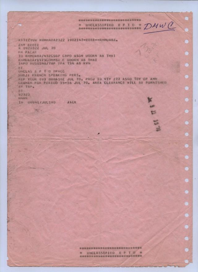 Veterans Day is for all of us who are alive. It’s a recollection (in my era of Vets) of “I’ll have a double tour to go and supersize the testosterone.”  I had to add that parenthesed codicil to squelch assuage any women combat pilots nowadays. When I flew down to Saigon to 7th TACC (Tactical Air Combat Control) to “volunteer” for Project 404 in July 1970, I asked a lot of questions which no one would answer. Everything was hush hush. All I got was this hot off the TTY and a rush clearance on the next bird to Saigon: