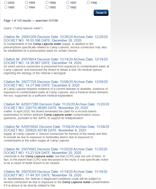 If I’m doing a case on Camp LeJeune cancer due to contaminated water, I type it in with quotes and it kicks out all the recent decisions I need to read to get a feel for how to fight the appeal and win. So scroll back up to the top and click on the BVA Decisions Search Site. Now, erase Hepatitis C and type in “Camp Lejeune water”. Hit the SEARCH button in the lower right. Give it a minute. Hell, you can even use VA’s abbreviation of CLCW(Camp LeJeune Contaminated Water) too. Makes you wonder if Veterans Law Judges pronounce it “CLICKWUH” claims. VA calls their senior raters DROs. Not D-R-Os. DRO like drove into town. I guess that makes VSRs Veezers or Veesirs? So much to learn. So little time. So about a 1 on my give-a-shit meter regarding VA employee pronunciation proclivities.