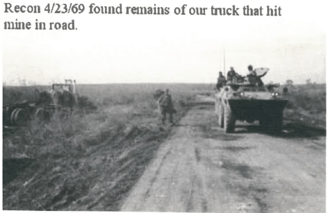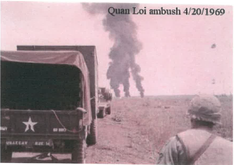 That first little curl of smoke to the right is the tractor my Vet was riding shotgun in with a Pig and six cans of 7.62 when they hit the mine. He said it was like being in a washing machine with all the ammo and the Pig flying around. He woke up a while later and dragged his driver out away from the burning vehicle. Look at how far the explosion threw their rig off the road. No TBI/PTSD here, folks. Nothing to see. Move along.